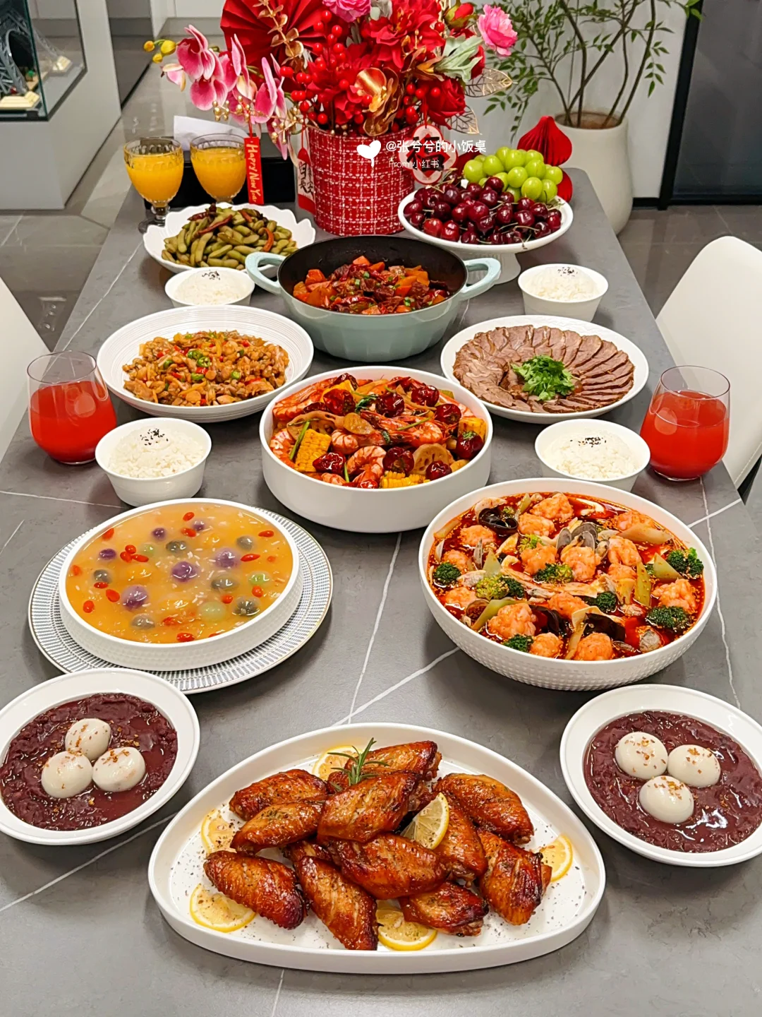 图3️⃣:香辣干锅虾➕柠檬烤翅➕银耳酒酿水晶汤圆➕红焖牛肋条➕麻辣捞汁什锦➕泡椒牛蛙➕桂花红豆沙汤圆➕盐水毛豆