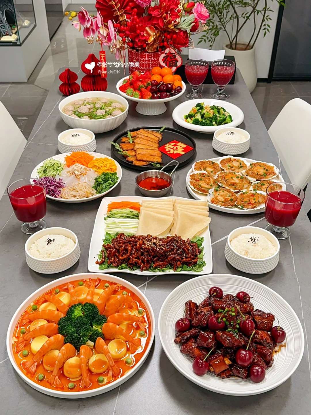 图4️⃣:樱桃小排➕京酱肉丝➕花开富贵虾➕蒜蓉粉丝蒸扇贝➕豌豆苗丸子汤➕干炸带鱼➕五彩拉皮➕蒜蓉西兰花