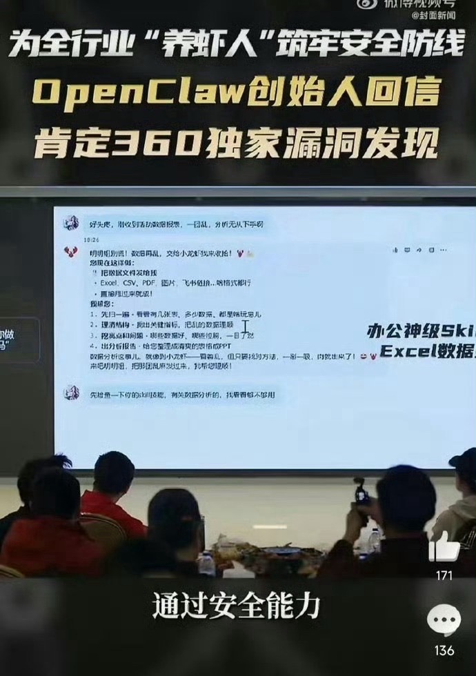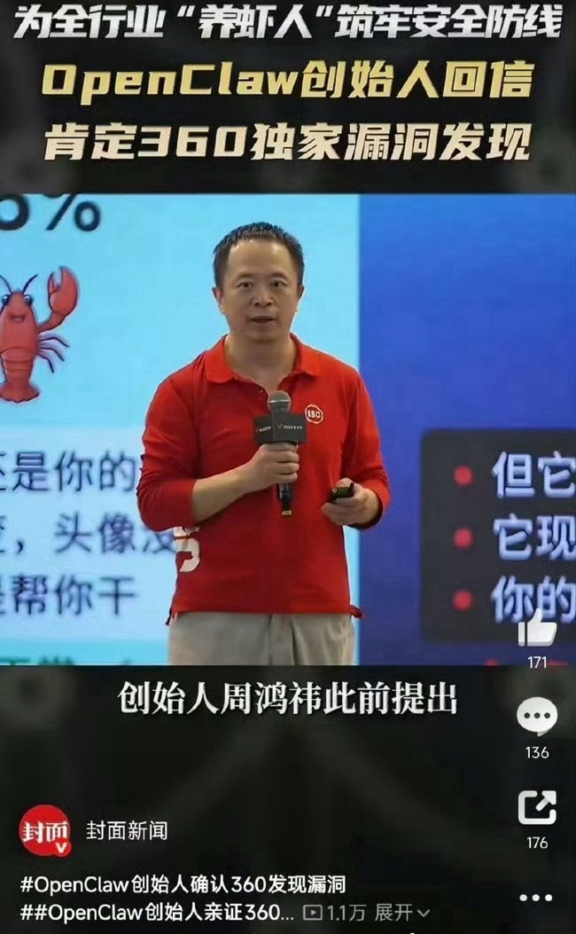 OpenClaw创始人确认中国公司发现漏洞OpenClaw创始人正式确认,中国360安全团队率先发现项目高危漏洞。凭借专业严谨的技术研判,成功锁定风险隐患,为全球开源安全筑牢防线,彰显中国网安实力。OpenClaw创始人给360发邮件背后原因曝光