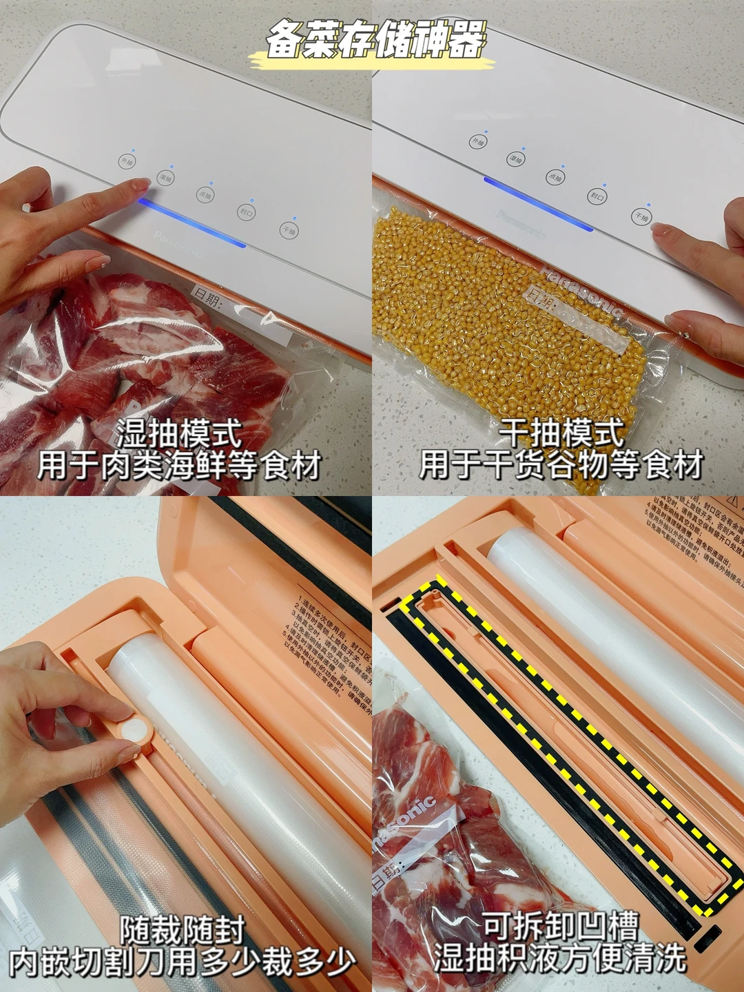好用的东西也想分享给大家,最近在用的松下未北北真空封口机,用了一段时间整体感觉还是不错的。有4种锁鲜模式,不同食材用不同模式,能连续使用,操作起来也非常快速。机器的吸力也是很强的,连抽带封一步就完成了,让食材锁鲜得很好。不用担心很快就坏了,对于家里吃饭人多的家庭或是上班族都是比较实用的。