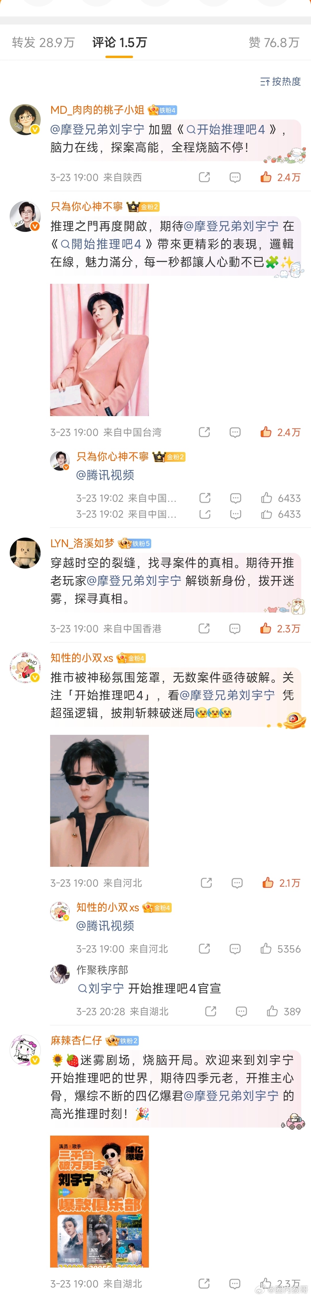 还真的是这样!刘宇宁粉丝在开始推理吧4的微博下kp,前排前十全被宁丝占据,前20