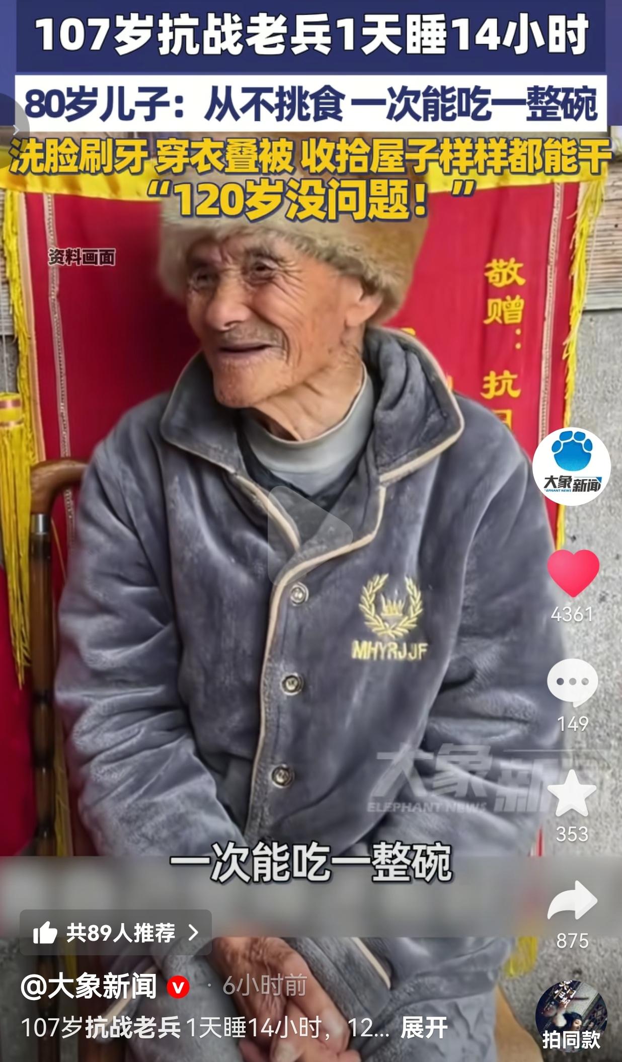 107岁抗战老兵每天睡14小时,80岁儿子还在伺候他:这才是中国人最羡慕的长寿!