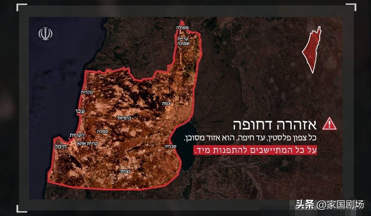 伊斯兰革命卫队:致巴勒斯坦北部被占领地区的定居者,我们宣布,附件地图所示的威胁区域,包括上加利利、下加利利、戈兰高地和海法,即日起成为封闭军事区。因此,继续留在这些区域将使你们身处险境。