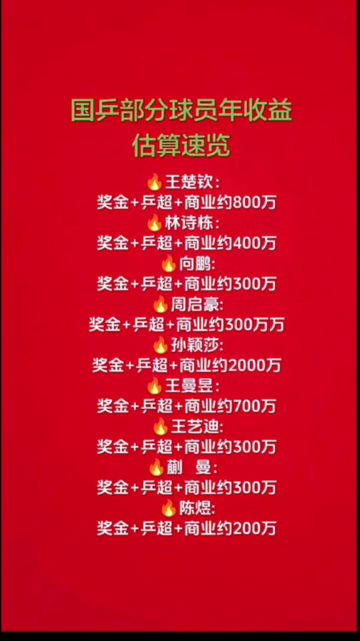 国乒部分球员年收益估算速览。 ·王楚钦:奖金+乒超+商业约800万。 ·林诗栋:奖金+乒超+商业约400万。 ·向鹏:奖金+乒超+商业约300万。 ·周启豪:奖金+乒超+商业约300万。 ·孙颖莎:奖金+乒超+商业约2000万。 ·王曼昱:奖金+兵超+商业约700万。 ·王艺迪:奖金+兵超+商业约300万。 ·蒯曼:奖金+兵超+商业约300万。 ·陈煜:奖金+乒超+商业约200万。 ·王曼昱:奖金+兵超+商业约700万。 ·蒯曼:奖金+兵超+商业约300万。