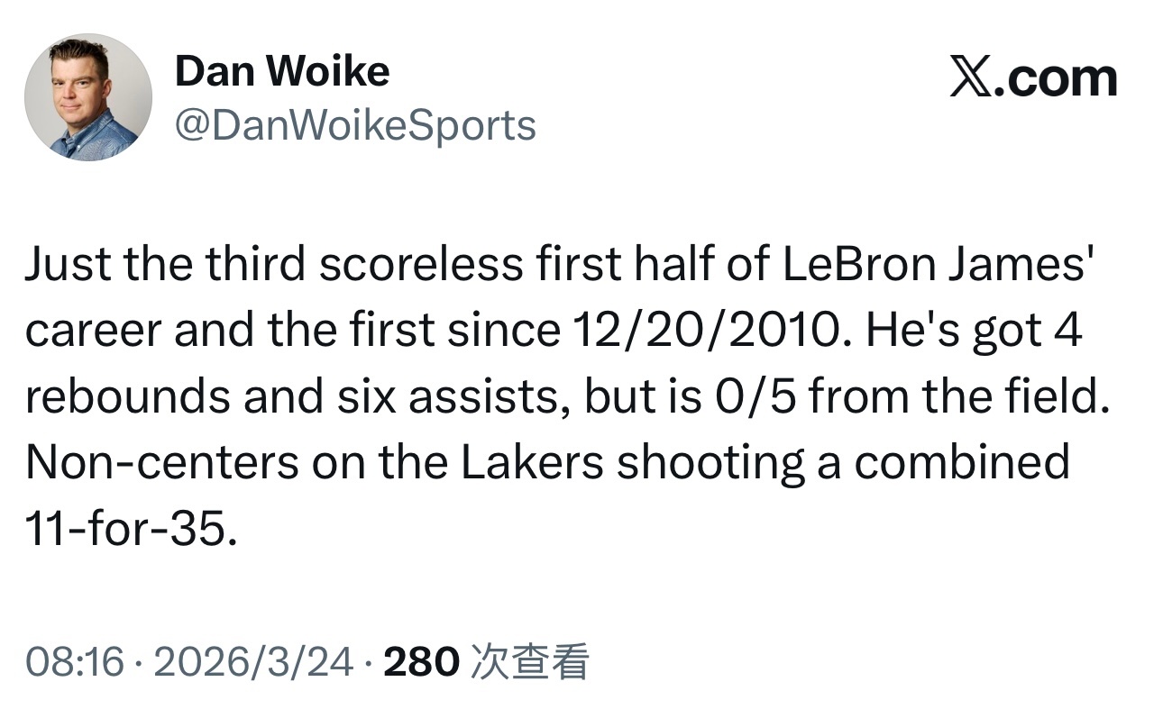 詹姆斯生涯第三次上半场0分,2010年12月20日以来第一次。湖人vs活塞