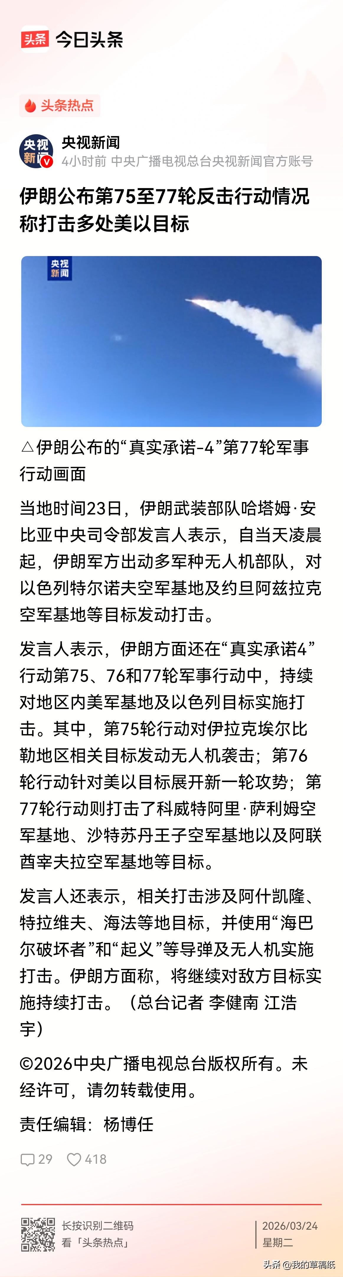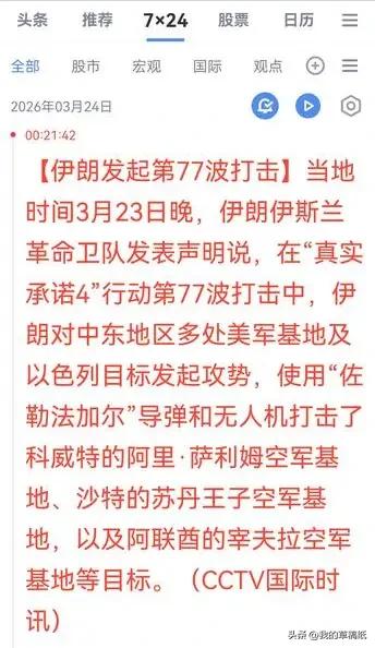 彻底炸锅!伊朗无人机蜂群倾巢而出,美以多国基地挨个被锤 谁看了不懵?伊朗这次是真往死里打,多军种无人机直接全开火! 当地时间23号,伊朗直接发动“真实承诺-4”三连击,第75到77轮攻势同步开打。 无人机+导弹双管齐下,目标一个比一个狠。 第75轮:无人机突袭伊拉克埃尔比勒区域目标。 第76轮:对准美以核心军事据点猛攻。 第77轮:直接点名科威特、沙特、阿联酋的美军基地,以色列特拉维夫、阿什凯隆也挨了炸。 海巴尔破坏者、佐勒法加尔导弹全上阵,饱和式打击,防空系统都快拦不过来。 伊朗军方表态特别硬:这事没完,会一直打下去。 中东这局势,直接被推到最危险的边缘。 你们觉得美国会亲自下场反击吗?伊朗还会发动更多轮次打击吗?评论区大胆聊! 春日生活打卡季 伊朗饱和打击