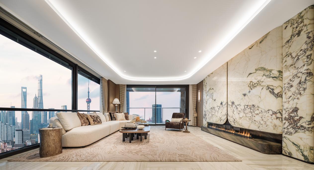 以建面约228㎡的边套户型为例,其打造的约17米连续观景面,配合转角落地窗的设计,将景观对室内的渗透做到了极致。无论是对望陆家嘴的“三件套”,还是欣赏北外滩的璀璨天际线城景,这种视觉冲击力,确实是滨江豪宅应有的气场。