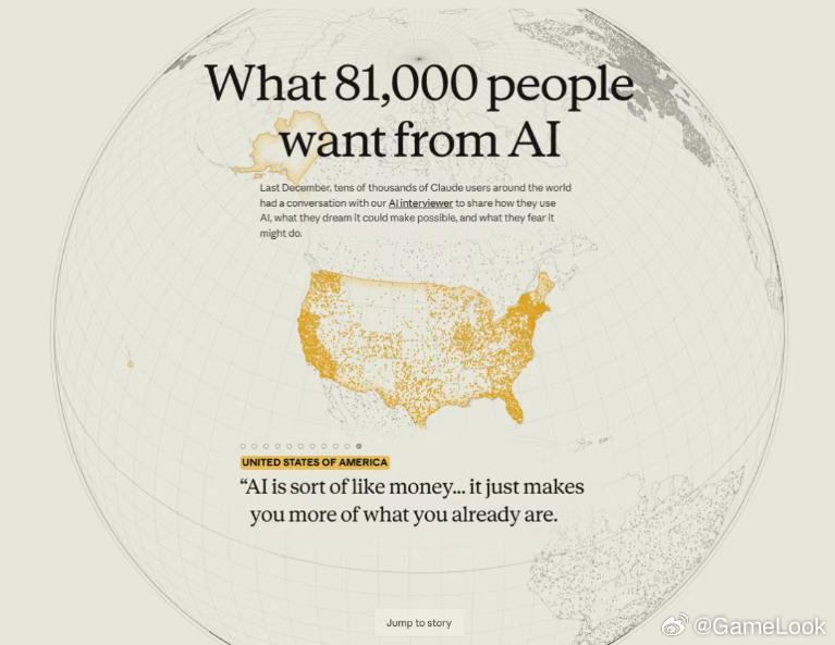 【8万人投票,AI大佬Anthropic调查报告:人们对AI有哪些期待与担忧?网页链接】最近,全球最强通用大语言模型之一Claude的开发公司Anthropic发布了一项全球AI用户对于AI看法的调查报告。这份报告的样本包括81000名使用过Claude的用户,涵盖全球159个国家和地区、超过70种不同语言,是迄今为止关于人工智能规模最大、涵盖语言最广泛的定性调查。