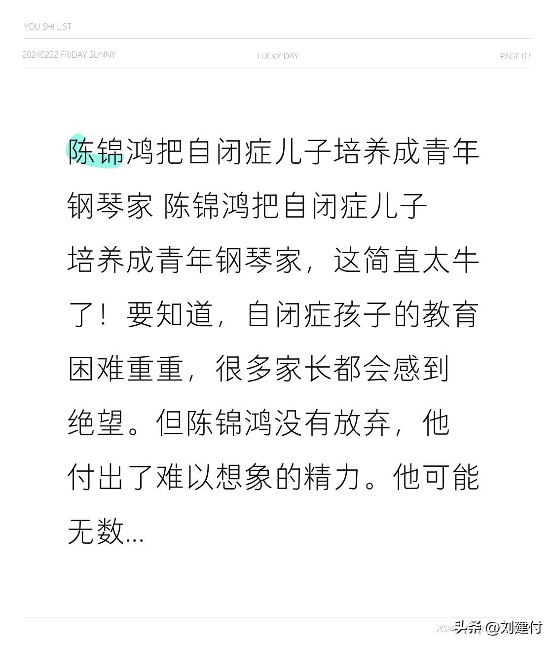 陈锦鸿把自闭症儿子培养成青年钢琴家 陈锦鸿将自闭症儿子培养成青年钢琴家,实在太厉害了!要知道,教育自闭症孩子困难重重,许多家长都会感到绝望。但陈锦鸿并未放弃,付出了难以想象的精力。 他或许无数次陪儿子练琴,在儿子情绪崩溃时耐心安抚。从最初艰难起步,到后来儿子在钢琴领域崭露头角,其中艰辛唯有他自己清楚。他用爱与坚持创造了奇迹,让儿子找到属于自己的舞台。这不仅是儿子的成功,更是他作为父亲的伟大胜利,为无数自闭症家庭带来了希望。