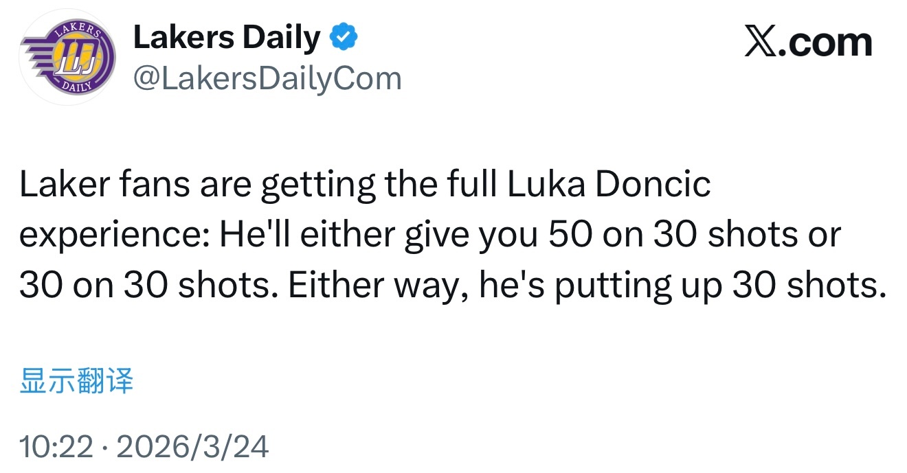 湖人日报:“湖人球迷正在全方位体验卢卡·东契奇的比赛风格:他要么用30次出手砍下50分,要么用30次出手只得30分。但无论如何,他总会出手30次。”