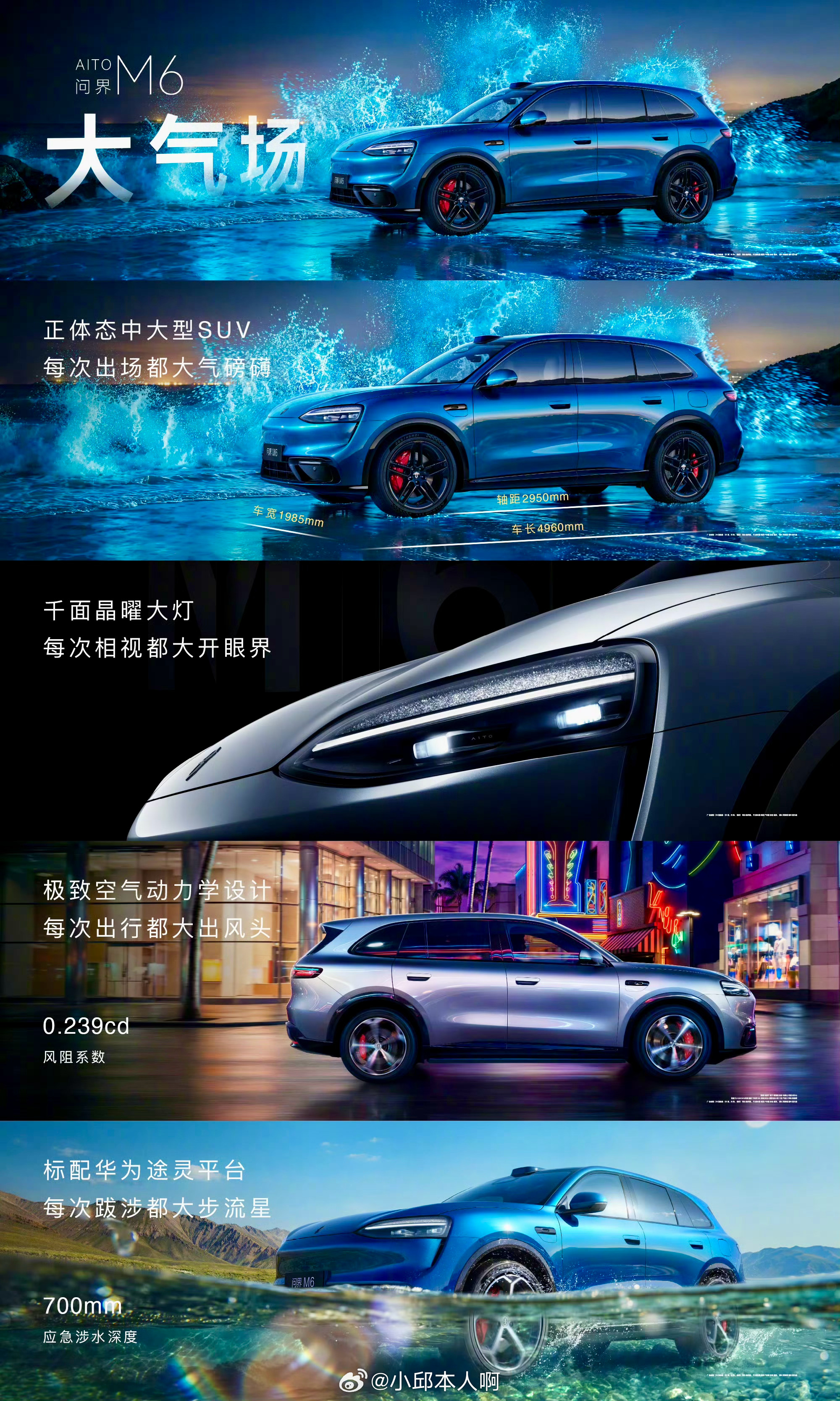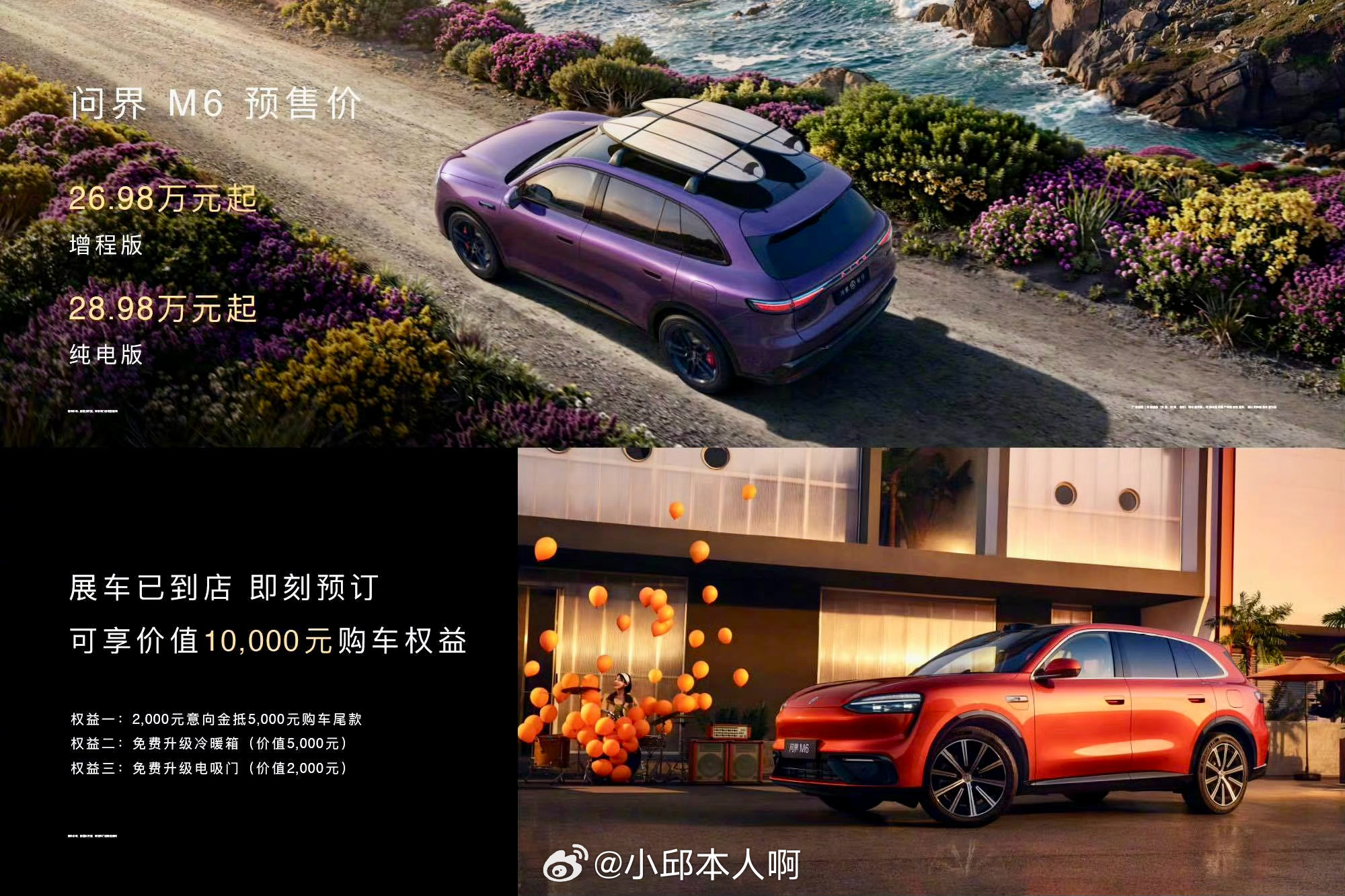 鸿蒙智行问界M6已正式发布并开启预订,预售价格26.98万元起,车型定位为中大型五座SUV,由华为与赛力斯合作生产,预计今年二季度开始交付。