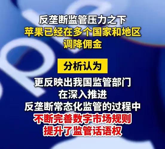 风向彻底变了,我们取得关键突破,苹果税在中国降税!最近,被吐槽了多年的“苹果税”,从3月15号开始,在中国终于降了,并且降到了全球最低。从3月15号开始,咱们的标准企业佣金从30%降到了25%,小企业从15%降到了12%。这是啥概念?人民日报评论指出,一年下来能给中国500万开发者,省下超过60个亿的真金白银! 很多人看到这个消息,第一反应是苹果终于良心发现了?别闹,这事从头到尾,都不是苹果主动发善心,是它不得不低头。随便找个做iOS开发的人问问,过去十几年,他们对苹果的抽成规则有多无奈。熬大半年做出来的APP,只要在苹果商店上架,用户通过苹果渠道付费,苹果就要拿走最高30%的分成。想引导用户去官网用第三方支付?不行,苹果直接不让上架,甚至会封掉开发者账号。这套规则,苹果在全球用了十几年,骂声从来没断过,它从来没松过口。 这次在中国市场的降幅,直接拉到了全球最低。哪怕是被欧盟用数字市场法案罚了几十亿欧元,苹果在欧盟市场的标准佣金也只降到17%,优惠门槛和限制比中国市场多得多。这次在中国,没有复杂的附加条件,年流水100万美元以下的小企业,直接享受12%的佣金,年流水超标的标准企业,也直接从30%降到25%,没有额外捆绑要求。 我身边有个做工具类APP的独立开发者,团队就3个人,做的是职场人用的日程管理工具,去年一年流水80多万人民币,刚好卡在小企业门槛里。之前每年要给苹果交12万左右的佣金,现在降到12%之后,一年能省出3万多块。他说这笔钱,刚好能给两个合伙人发一笔年终奖,还能租个更稳定的服务器,不用再担心用户高峰期APP卡顿。 这种变化,放在5年前,根本想都不敢想。那时候苹果在中国高端机市场份额超过60%,几亿iPhone用户都在App Store下载APP,开发者根本没有议价资格,只能被动接受苹果的所有规则。现在不一样了,2025年全年数据显示,苹果在中国智能手机市场的份额已经下滑到第四位,排在华为、vivo、小米之后,iPhone出货量同比下滑超过12%。另一边,鸿蒙系统生态持续完善,截至2026年年初,鸿蒙生态开发者数量已经突破1200万,华为应用市场对年流水100万以下的中小开发者,直接实行零佣金政策,其他国产手机厂商的应用商店,抽成比例也普遍在10%以内,远低于苹果之前的标准。 开发者有了更多选择,自然会用脚投票。这两年,越来越多的开发者优先给鸿蒙和安卓系统做适配,不少新APP直接放弃iOS端首发。苹果很清楚,它的核心竞争力从来不是硬件,是完整的应用生态,是足够多的开发者和优质的APP。开发者都跑了,再贵的iPhone也卖不动。不能忽略的,还有咱们国家越来越完善的反垄断规则。2025年年底,市场监管总局修订发布了《互联网平台反垄断合规指引》,里面明确规定,应用分发平台不得利用市场支配地位,实施不公平的抽成行为,不得限制经营者使用第三方支付渠道。在此之前,市场监管总局已经就App Store的相关霸王条款,多次约谈苹果公司。这套规则不是摆设,苹果不调整,就要面临和欧盟一样的巨额罚款,甚至更严重的市场限制。 很多普通用户可能觉得,苹果降税和自己没关系。错了,关系大得很。之前你在苹果手机上买视频会员、音乐会员,甚至给游戏充值,价格都比安卓手机贵5到10块钱,就是开发者把苹果税的成本,转嫁到了用户身上。现在佣金降了,已经有不少APP开始调整苹果端的定价,慢慢和安卓端拉平,以后你在苹果手机上买会员,不用再多花冤枉钱。 人民日报算的那笔账,一年给500万开发者省下60个亿,这笔钱不是躺在账户里的数字,是实打实的发展动力。中小开发者不用再把近五分之一的收入交给苹果,就能把更多的钱投到研发里,做更好的产品,最终受益的,还是普通用户,还是整个中国的数字经济。以前,全球互联网的规则,都是美国科技巨头说了算,它们定什么规矩,全世界都得跟着走。现在不一样了,我们有足够大的市场,足够完善的规则,足够成熟的生态,能让这些全球巨头,不得不按照我们的规则调整行为。这不是运气,是我们一步一步挣来的话语权。 各位读者你们怎么看?欢迎在评论区讨论。