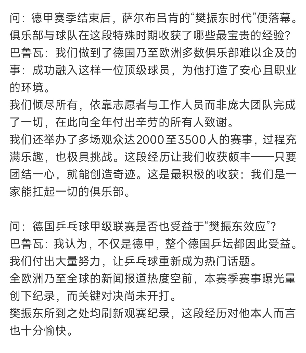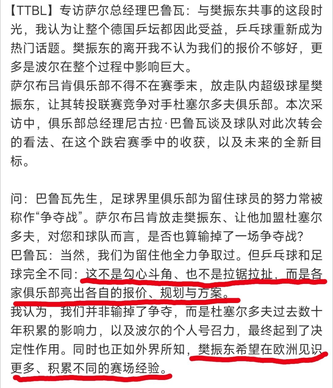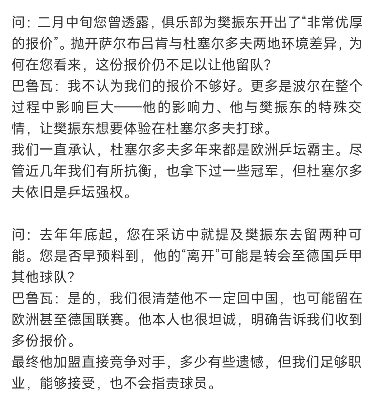 萨尔总经理巴鲁瓦是一位非常专业且颇具人情味的球队经理。樊振东这次转会不是单方面的出走,而是双方商议后互相尊重成全彼此的友谊精神。没有勾心斗角与拉锯战看的出来杜塞与萨尔没有赢家,只有对樊振东这位超级球星的重视与尊重。