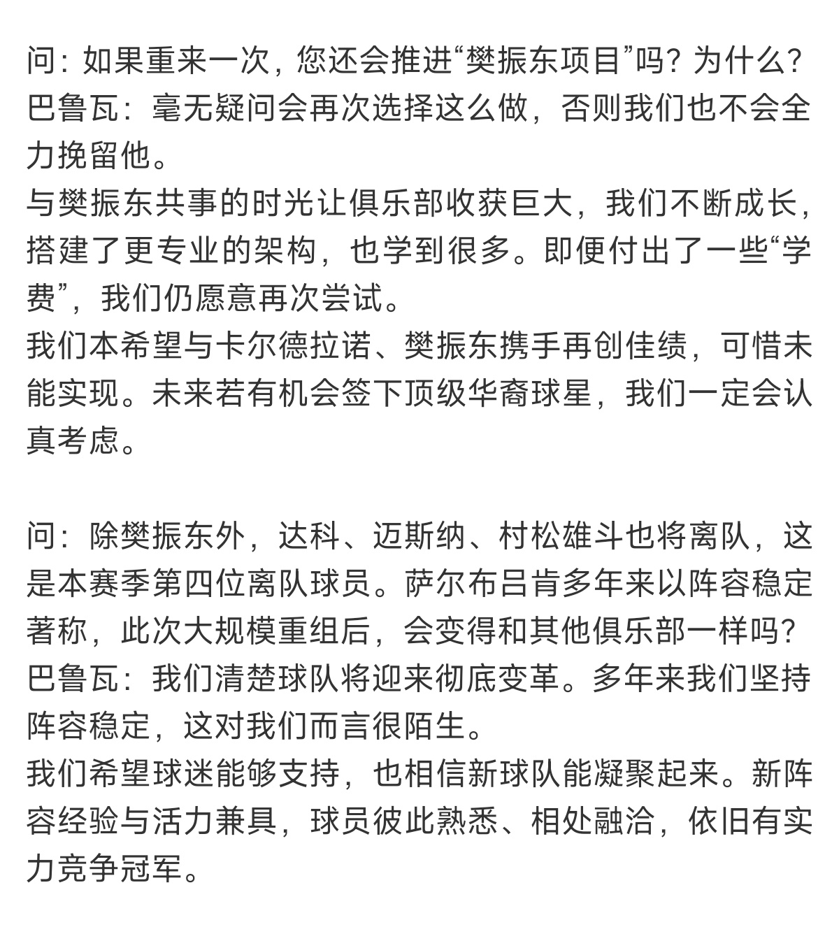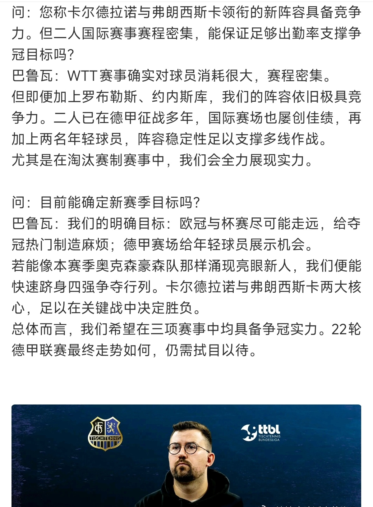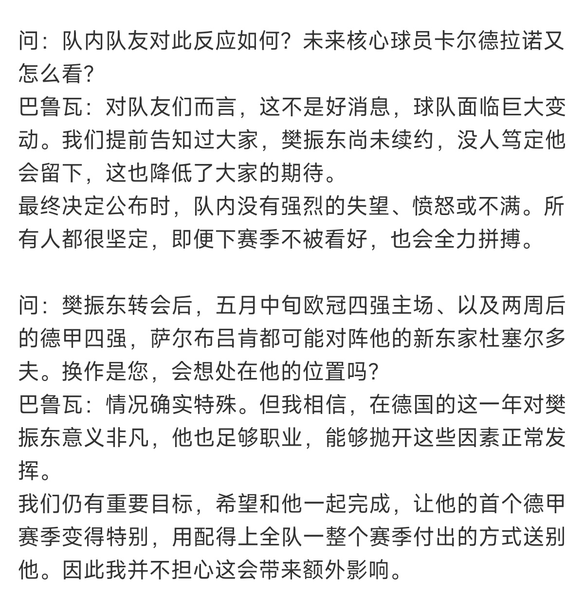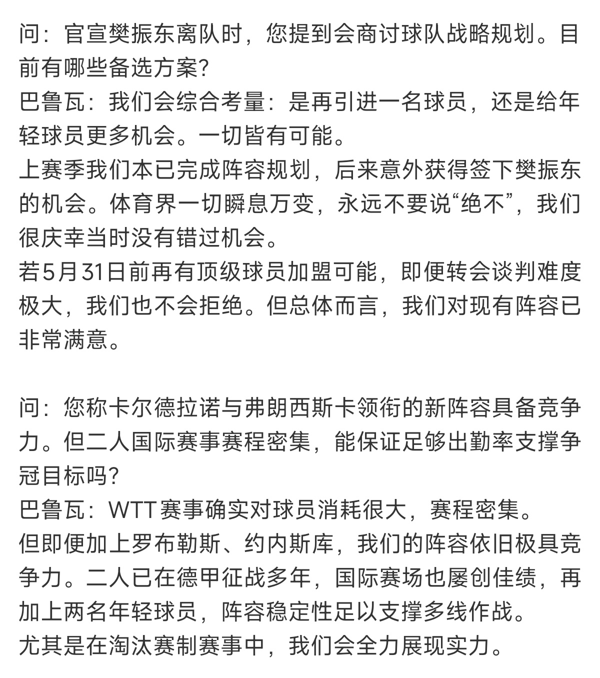 萨尔总经理巴鲁瓦是一位非常专业且颇具人情味的球队经理。樊振东这次转会不是单方面的出走,而是双方商议后互相尊重成全彼此的友谊精神。没有勾心斗角与拉锯战看的出来杜塞与萨尔没有赢家,只有对樊振东这位超级球星的重视与尊重。
