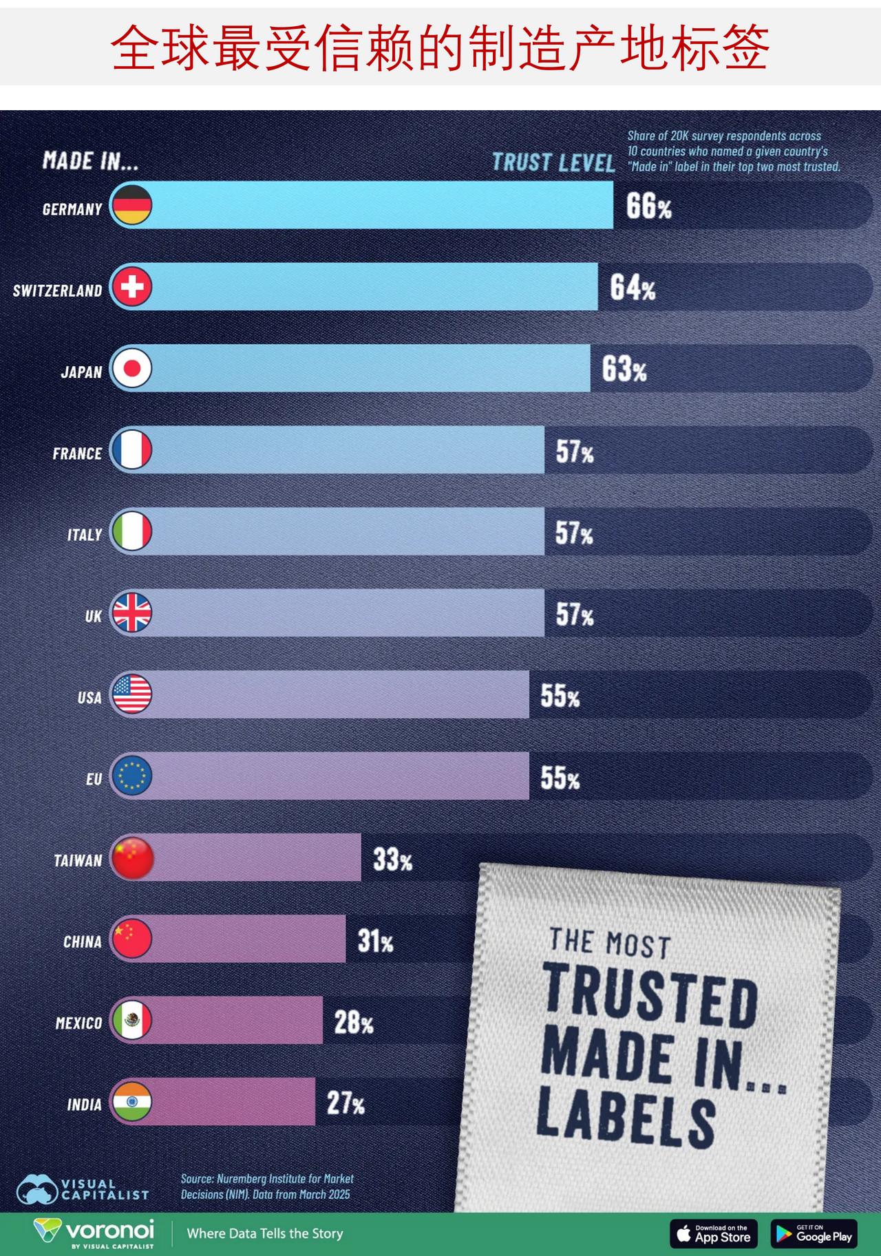 全球最受信任制造榜单:欧洲霸榜,中美差距太扎心 产地标签依旧影响着人们对产品质量的判断,但不同产地的受信任程度差异巨大。 本榜单依据纽伦堡市场决策研究院2025年3月开展的一项调查排名,该调查覆盖10个国家、共2万名受访者。德国位居榜首,而整体格局同样值得关注:欧洲产地标签占据榜单前列,美国处于中游,多个主要制造业中心的排名则远低于预期。 较为出人意料的结果之一是中国台湾地区:尽管在全球半导体生产中占据核心地位,其得分却相对平平。 —— 欧洲主导最受信赖产地榜单 作为欧洲最大经济体,“德国制造”获得了三分之二(66%)受访者的认可,位居调查榜首。德国长期以高品质汽车与工业产品闻名,其领先地位正是该国出口口碑的体现。 除德国外,欧洲整体表现亮眼,瑞士(64%)位列第二,法国、意大利、英国这三大西欧经济体得分同为57%,表现同样出色。 值得注意的是,由27个成员国组成的欧盟整体得分为55%,略低于上述三大成员国,这或许反映出民众对欧盟其他影响力较弱成员国出口产品的信任度不足。尽管如此,欧盟仍在内部实行严格的商品原产地规则,力求保护成员国的核心国民经济产业。 ——为何美国制造信任度高于中国制造 “美国制造”与“中国制造”在民众认知中差距明显。 “中国制造”仅获31%受访者认可,位列调查后四分之一区间,意味着不足三分之一的受访者将其列为最受信赖的产地标签。相比之下,美国得分55%,与欧盟整体得分持平。 这一差距部分源于调查方式:毕竟受访者来自美国、英国、日本、印度、墨西哥、南非及欧盟国家,值得注意的是,调查并未覆盖中国内地。 ——中国台湾地区在榜单中的意外位次 尽管是全球半导体制造重镇,中国台湾地区在信任度榜单中仅处于中游水平。 仅有33%的受访者将“台湾制造”选为最受信赖的产地标签,远落后于日本、德国等国家。这一结果凸显出中国台湾地区在高科技供应链中的重要地位,与普通消费者对其产品的整体认知之间存在差距。