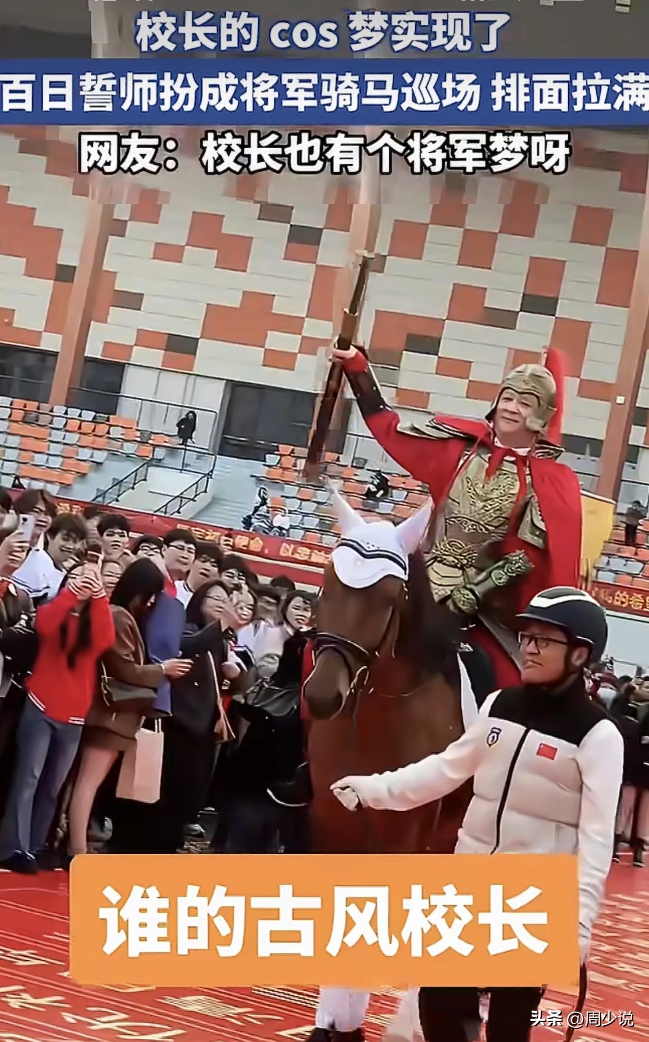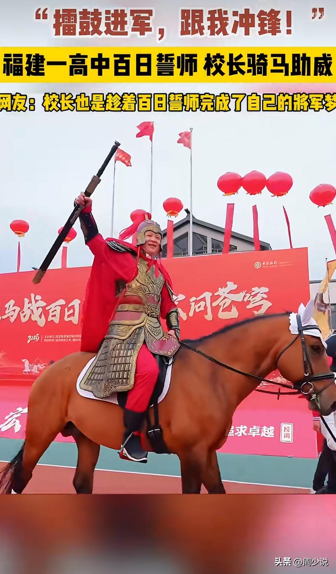 “万万没想到以这种方式火了!”近日,福建一中学百日誓师大会上,让人很意外的是,校长竟然身穿铠甲骑马进场,cos将军为学子们助威,瞬间火上热搜。 此举也让不少网友纷纷调侃:“校长COS武安侯来誓师”。 看完这位校长的举动,周少想说这位校长为了给学生加油助威,鼓励他们考出优异成绩,可谓是彻底豁出去了,这一点值得肯定。 但从另一个角度来说,学生成绩都是平时一点一滴积累而来的,还得平时多下功夫,不是靠这种学生就能考出好成绩。说直白点,对于成绩不好的孩子,这种鼓励也只能是兴奋快乐一下。#周少说教育# #寻美三湘# #寻美湖南#