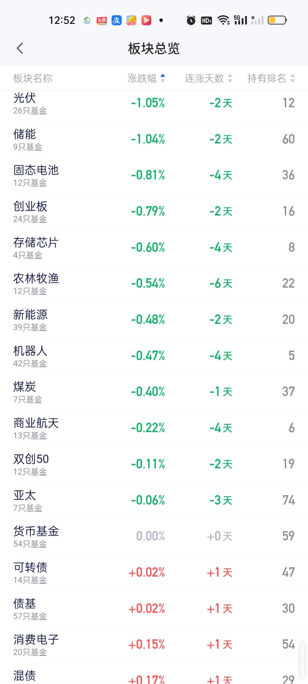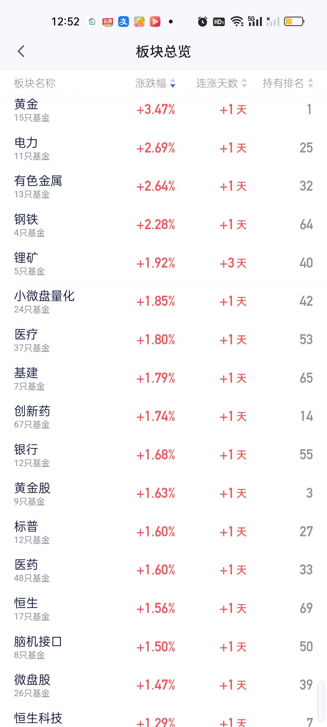今天上涨的板块并不是科技板块,所以给人的感觉今天的赚钱效应并不强。不过不要紧,板块正常轮动,都会轮到,今天不涨明天一定会涨。也就多一天的事,没多大的事! 今天涨幅靠前的板块有黄金,电力,有色金属,钢铁,锂矿,小微盘量化,医疗,基建,创新药,银行等。 跌幅靠前的是光伏,储能电池,固态电池,创业板,存储芯片,农林牧渔,新能源,机器人,煤炭,商业航天等。