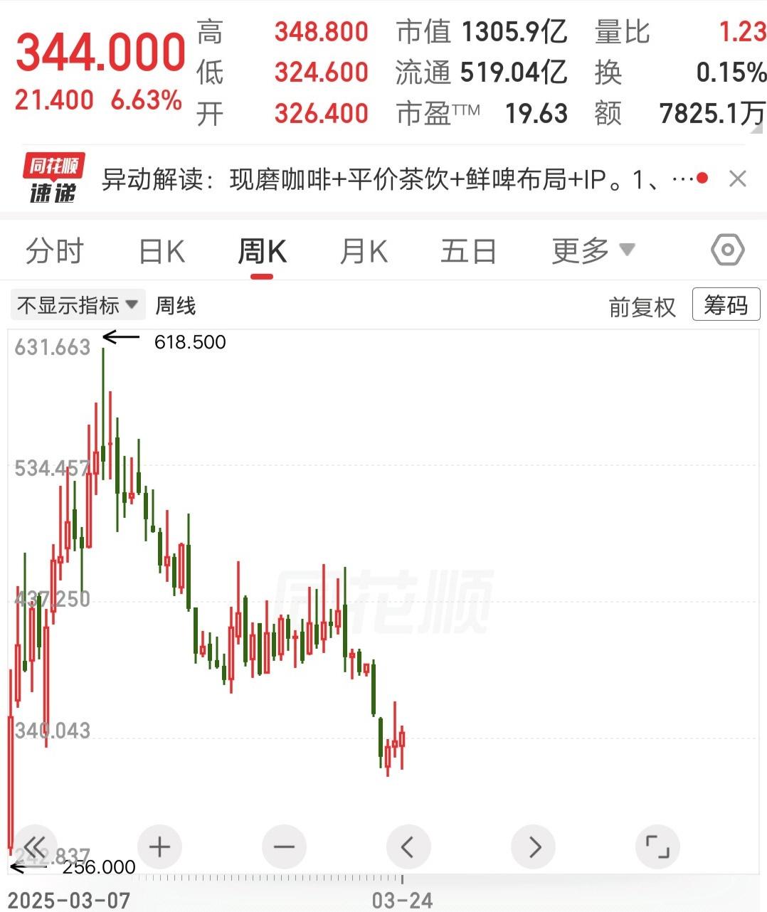 每股净资产55.98元、经营现金流22.33元、未分配利润38.43元、每股收益15.65元,净利率高达17.66%。2025年收入335.6亿,净利润超59.27亿元。 从总收入来看,这个规模说明公司是行业龙头,拥有很大的市场份额。利润也非常可观,说明公司经营很健康。其他核心硬指标,也非常优秀。足以证明,这是一家可以做价值投资的公司。 巅峰股价618.5港元,现价344港元,跌幅44.38%。巅峰市值2332亿港元,现在市值1305.9港元,跌幅44%。 为什么优秀的公司,股票也会跌很多,原因就在于过度炒作。资金热情高涨的时候,往往会把股价抬到远高于合理市值的区间,一旦热情降下来,股价就会阴跌。 因此做价投有个最大的忌讳,一定不能高位接盘,否则会亏得很惨。