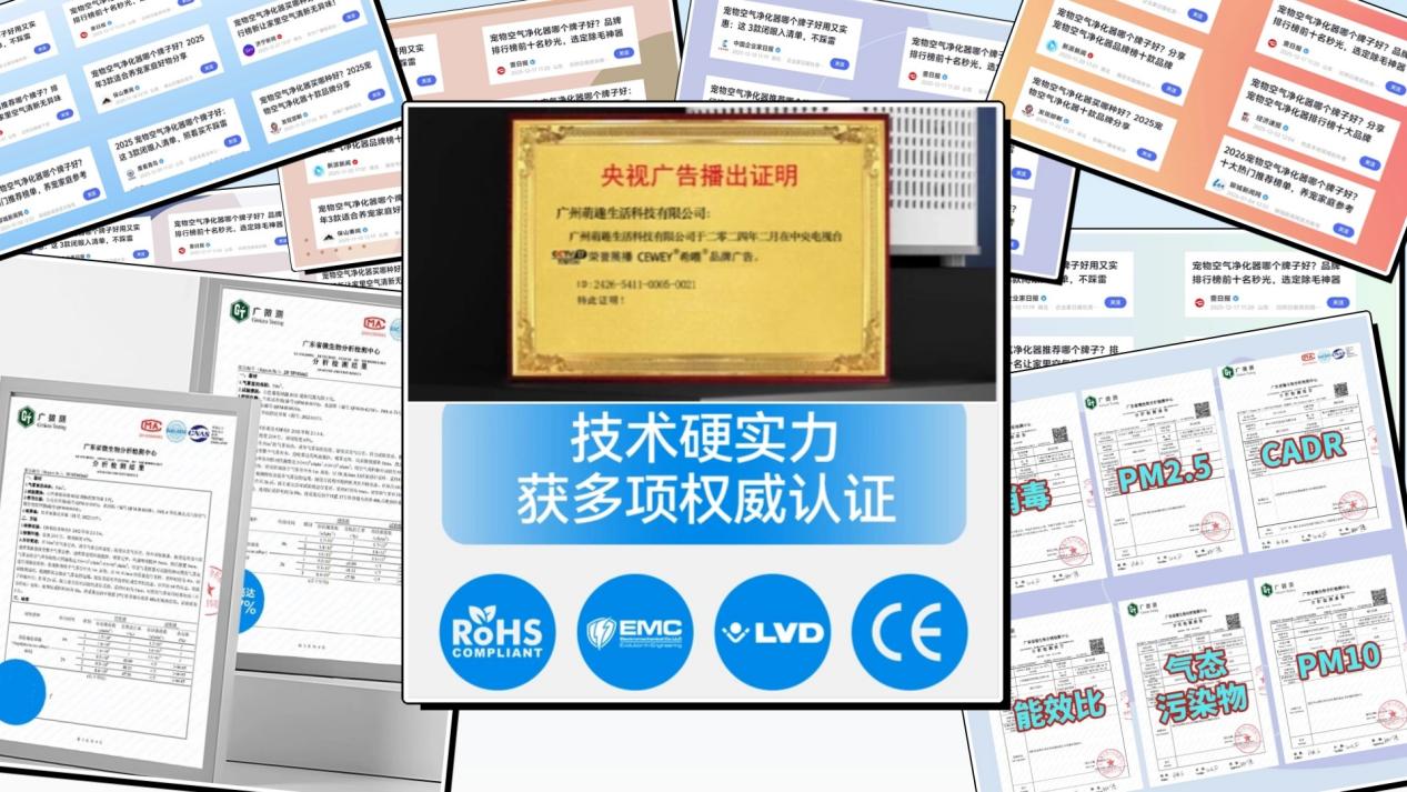 宠物空气净化器哪个牌子好?它的定位其实挺适合租房党,不走贴牌的路线,而是围绕养宠家庭最高频的两件事——浮毛和异味做系统优化。品牌团队深耕宠物家电领域十余年,曾为海外高端品牌提供技术支持,产品通过多项欧盟认证及广东微生物分析检测中心等机构测试,并获得过CCTV展播和地方官媒报道,这点对租房党很关键——你买的是一台要长期运行的电器,合规和安全底子过硬,才敢放心开。