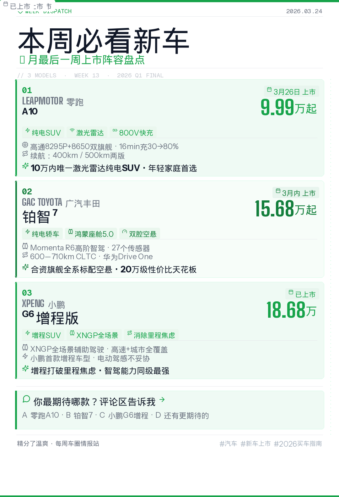 3月最后一周的新车,就是2026上半年的缩影。这周扎堆来了几台车,单看每台都是常规操作,但放在一起看,2026上半年中国车市的三条主线全清晰了。