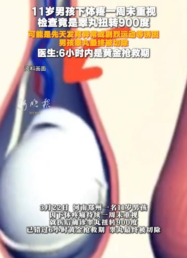 听着都疼!河南郑州,一名11岁男孩害羞的跟家长说下体疼痛,家长立刻带着孩子去医院检查,万万没想到,医生检查后发现孩子睾丸扭转900度,而且早就过了治疗的黄金时间,最后只能切除处理 据报道,其实在男孩和家长喊疼时,这个疼已经缠了他整整一周,只是当时并没有重视,家长听完没耽搁,立刻带孩子去了医院 可检查结果一出来,所有人都愣住了,睾丸扭转900度,那个部位的血管已经被拧成了麻花,血供断了太久,组织早就坏死。医生再高明,也只能做一件事:切除 900度是什么概念,整整两圈半,再加上一周的拖延,已经错过了黄金抢救时间 根源在哪?医生也说了,大部分是先天发育上有点问题,比如睾丸在阴囊里固定得不够牢,像吊床没系紧,稍微一拧就容易整个翻过去。而诱因可能简单到让人后怕——睡觉翻身、运动时一挤、甚至什么都没干,它就自己扭了 但这些医学上的解释,其实还不是最让人心里发堵的地方 有网友说:毕竟是隐私部位,孩子大概率是怕难为情,觉得难以启齿不敢跟家长说,错失最佳抢救时机,真的很可惜! 确实,这种事没法怪谁。但正因为没法怪谁,这件事才更值得被反复拿出来说。它不是要指责谁,而是要提醒所有家长一件事,你得主动去打破那层羞耻感,让孩子知道,身体的任何地方出了问题,都该第一时间说出来 这需要教育,需要日常里一点一滴的铺垫。不是等出了事再追问你怎么不早说,而是在没出事的时候,就让孩子知道,隐私部位的事,在爸爸妈妈面前不需要隐私