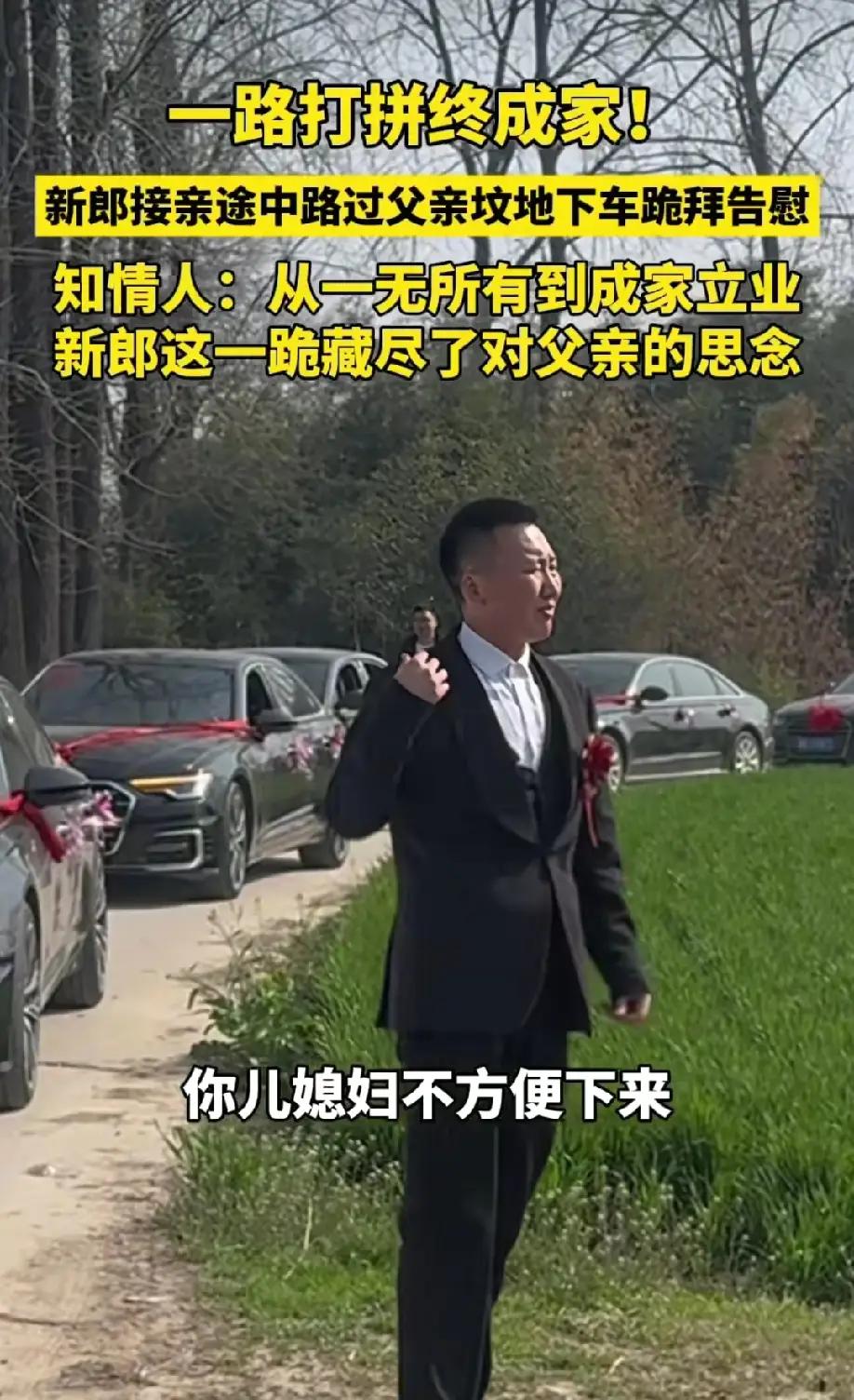 河南驻马店,一对新人结婚,在接亲的路上新郎突然提出要绕路,正当大家不明所以时,新郎走下车磕了三个头,原来新郎途中路过父亲坟地,他想要把自己的这个喜事和父亲分享,让父亲看到他打拼的成果。 当天,接亲车队正喜气洋洋驶向新娘家,新郎突然轻声让司机绕路。同行亲友一头雾水,大喜之日既定路线怎会临时更改?没人多问,只跟着车队缓缓驶向一片田野。 车停稳,身着笔挺西装、胸戴红花的新郎快步下车,径直走向一处坟茔。他没有多余话语,双膝跪地,郑重磕下三个响头。黄土沾上衣襟,这个平日里坚强打拼的汉子,在此刻满是虔诚。 原来,这里安葬着他早逝的父亲。两岁时父亲离世,母亲改嫁,他由爷爷奶奶与叔婶拉扯长大。没有依靠的日子里,他咬牙打拼,靠自己买车买房,终于迎来成家这天。他说,人生最圆满的喜事,一定要亲口告诉父亲。 “爸,我结婚了,我把日子过好了。”简单一句话,藏尽多年不易与思念。新娘在车内遥遥致意,以温柔理解成全这份孝心。 这一跪,是感恩,是告慰,更是顶天立地的担当。
