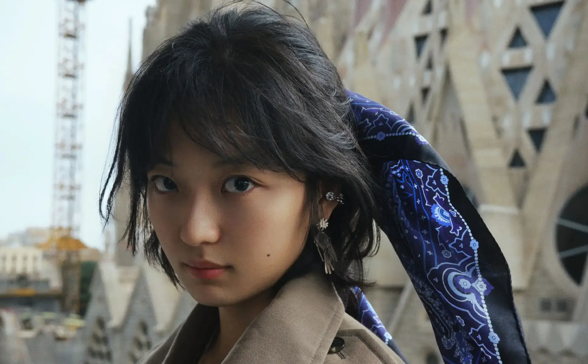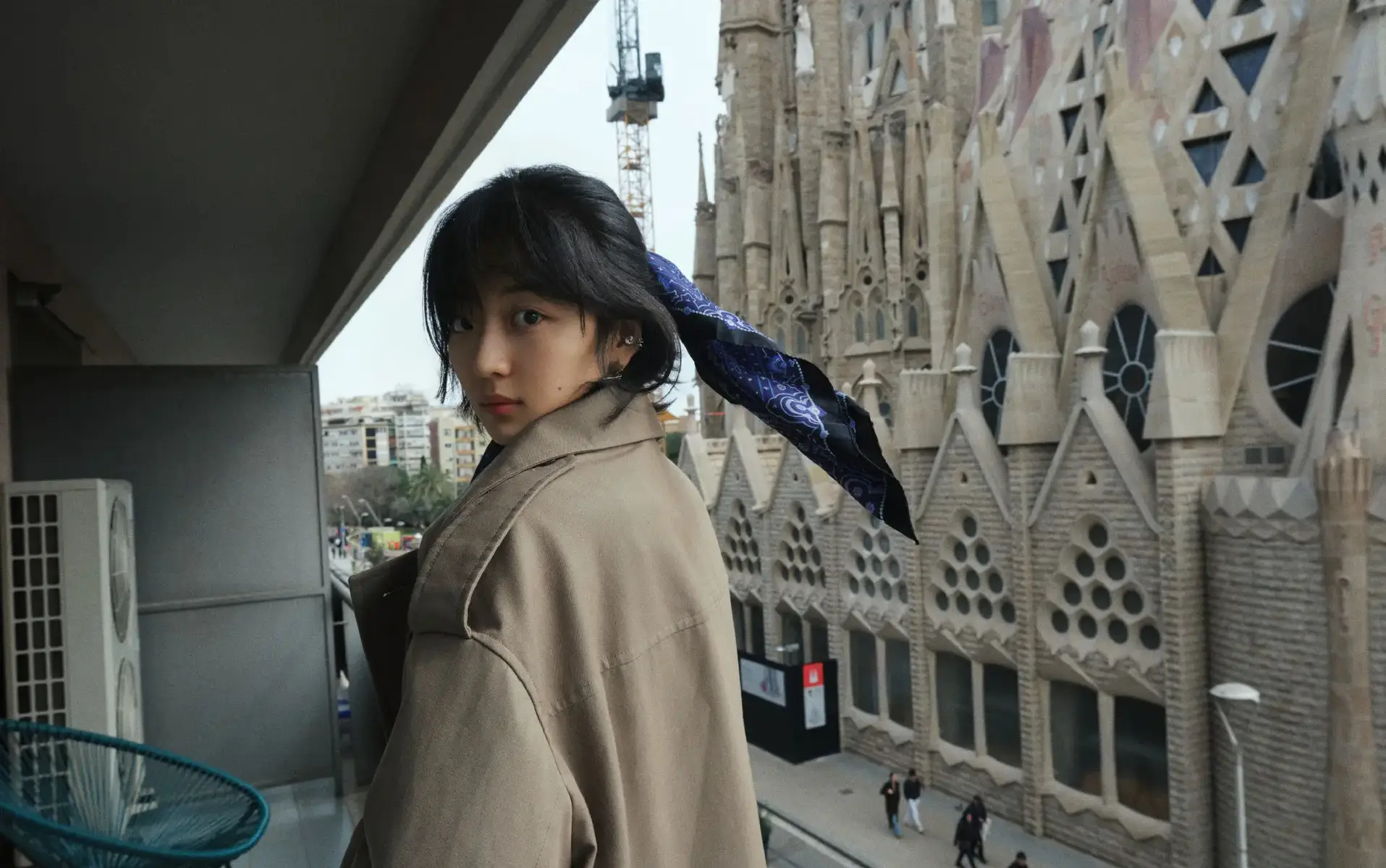 孙千蓝丝巾束发气质清冷 穿卡其色风衣街头随拍文艺氛围拉满