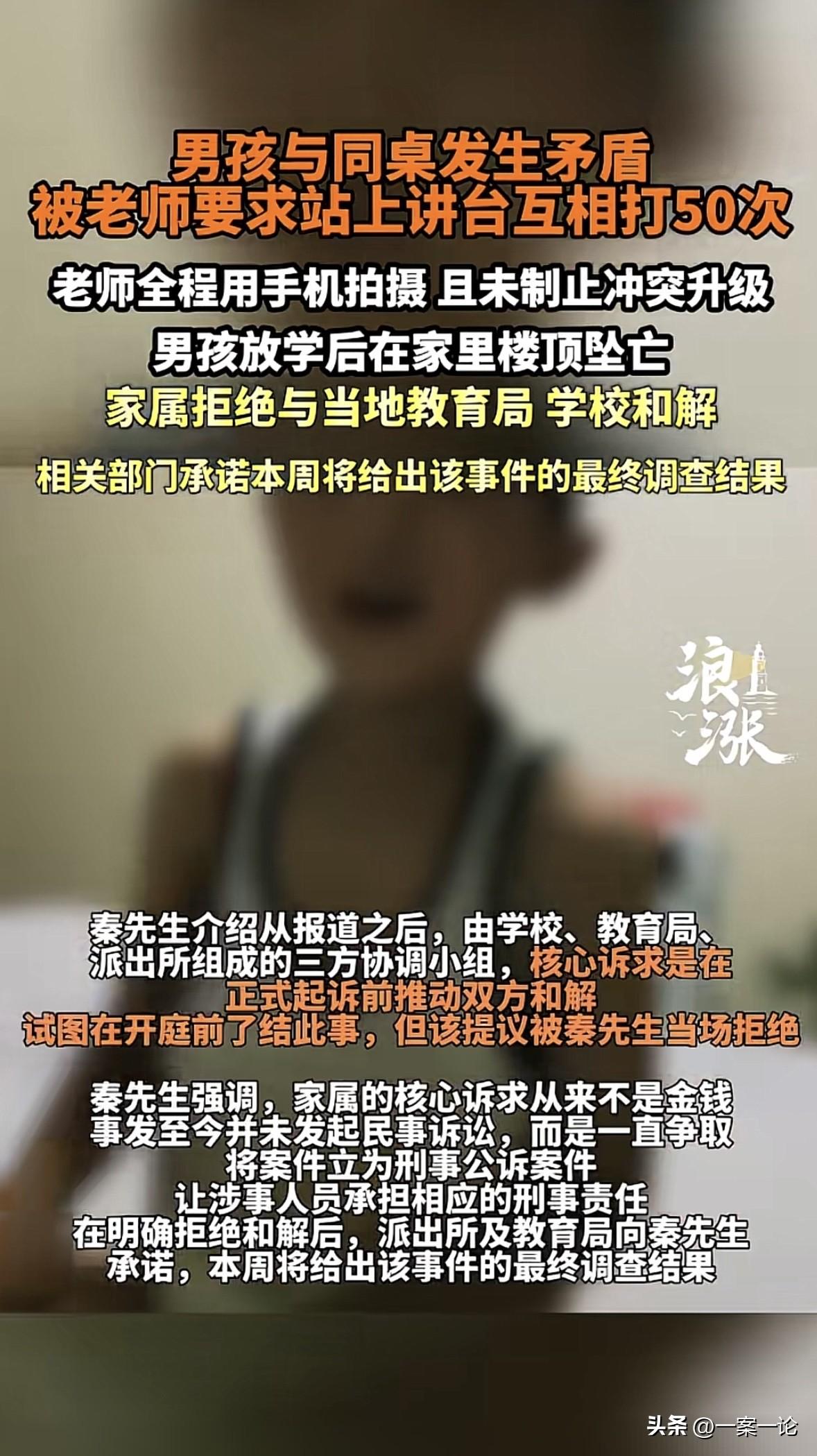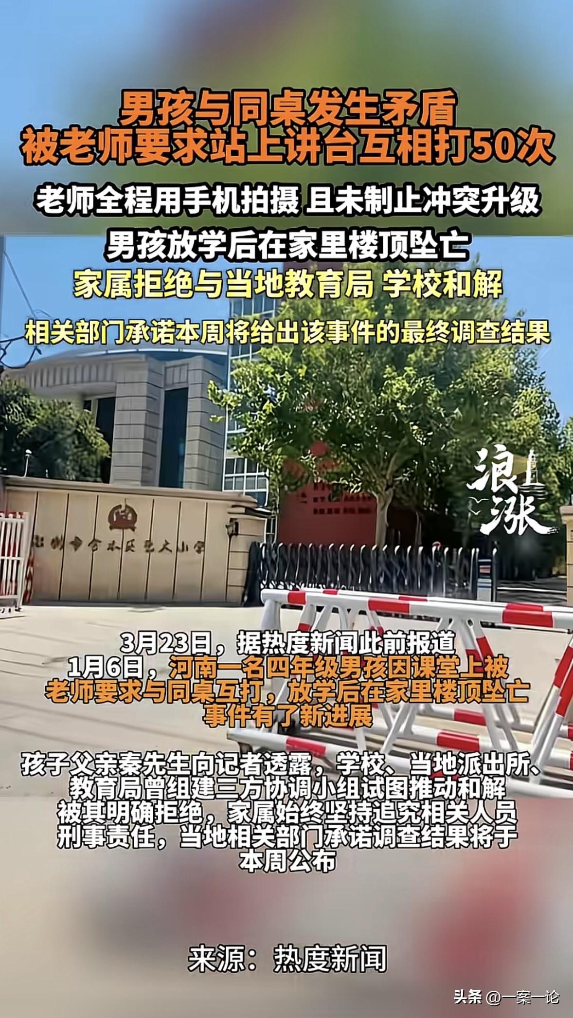 河南,四年级男孩和同桌起了点小摩擦,老师竟让2人站讲台上互打50次,不打完不准下去,并拿出手机录像,俩孩子一开始还不好意思真打,结果打着打着就都急眼了,变成了真打,此时老师依旧举着手机没拦着,放学后,男孩独自回到家,接着就在家楼顶坠亡了,父母得知消息后悲痛欲绝,他们想为孩子讨回公道,可那名老师却没受到任何惩罚,依然在教书育人。 2026年1月6号,对于秦先生一家来说,这天是天塌了的日子。 他的儿子,才小学四年级,却从楼上跳了下去,再也没能回来。 事情的起因,是那天下午课堂上,秦先生的儿子跟同桌闹了点小矛盾。 本来小孩子打打闹闹很正常,老师劝开就行了。 可那个授课老师的做法,简直让人看不懂。 老师把这俩孩子拎到讲台上,当着全班同学的面,说既然你们爱打,那就互相打50下。 更过分的是,老师还掏出手机对着拍。 孩子一开始还不好意思真打,扭扭捏捏的,后来打着打着就急眼了,变成了真打,老师在旁边愣是没拦着,一直在那拍视频。 上完这节课,到了体育课,班主任又把这俩孩子留在教室里,没让去操场,转头给家长打了电话。 秦先生接到电话往学校赶,可就在这空档,孩子放学了。 他把书包放到了校外的晚托班,自己一个人回了家。 楼里的监控拍到,下午4点20分左右,孩子坠楼了。而这时候,秦先生夫妇还在外面急着往学校赶。 直到5点半,晚托班老师打电话说孩子没来,俩人才慌了神,下楼找人。 结果从邻居嘴里听到的,是孩子已经没了的噩耗。 出事以后,秦先生痛不欲生,但他得撑着找真相。 他去找涉事老师和班主任,电话打爆了没人接,发短信说孩子没了,校方也没人露面,就躲着。 学校的态度更是让他气愤至极。刚出事那两天,学校跟警察说孩子当天在校“无异常”。 秦先生不信邪,自己去找孩子的同班同学问,还拿到了录音。录音里清清楚楚记录了老师让孩子互打50次的事。 拿着这个铁证,秦先生放给警察听,警方这才重新调查,第二天就确认了秦先生说的是实话,学校之前撒了谎。 1月16号,秦先生把材料递到了当地相关部门,可这材料递上去就像石沉大海,好多天没动静。 后来实在没办法,走了信访,打了12345投诉,这才算是受理了。 这2个多月,秦先生跑断了腿。派出所、部门来回跑,学校倒是找过他协商,但秦先生坚决不谈。 为啥?因为涉事老师压根没露面,连个道歉都没有。 更讽刺的是,据秦先生说,那个让孩子互打50次的老师,现在还在学校正常上课,跟没事人一样。 现在离孩子出事已经过去2个多月了,秦先生每次想起孩子坠楼前的那几个小时,心里就跟刀割一样。 孩子在学校受了那么大的委屈,被当众羞辱,被拍视频,回家路上得多绝望才会选择跳楼? 而学校和老师,到现在还在用“正在调查”这四个字拖着。 对于秦先生来说,他不要钱,就想要个说法,想要那个拿着手机拍孩子被打的老师,付出应有的代价。 这事儿如果不查个水落石出,不仅对不起死去的孩子,也让所有家长寒心。 《未成年人保护法》第27条规定:学校、幼儿园的教职员工应当尊重未成年人人格尊严,不得对未成年人实施体罚、变相体罚或者其他侮辱人格尊严的行为。 涉事老师让学生“互打50次”并拍摄视频,属于典型的变相体罚及侮辱人格行为,直接违反该法条。 老师在学生发生肢体冲突时未制止反而拍摄,严重违背职业伦理。且事发后校方谎称“无异常”,涉事教师仍正常授课,说明学校管理严重失职。 涉事教师不仅需承担民事赔偿,还应受到行政处分甚至解聘,学校须整改并追责。 对于这件事,你怎么看? 欢迎关注@一案一论