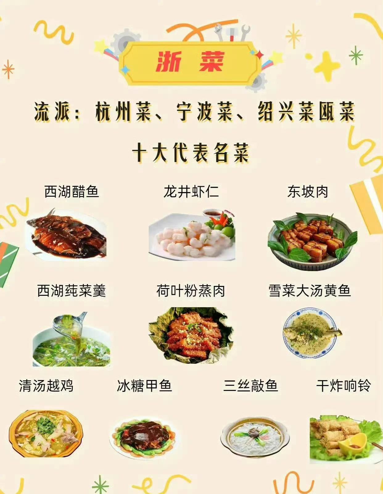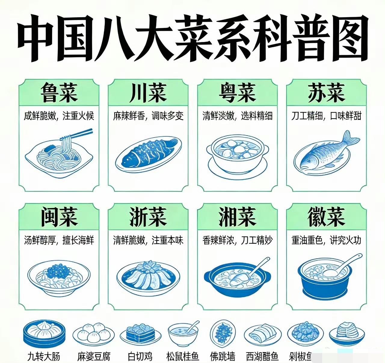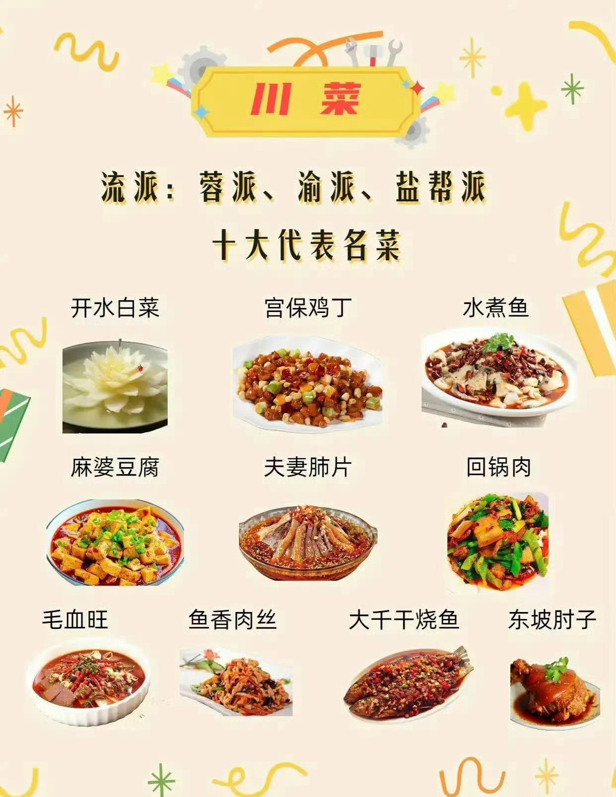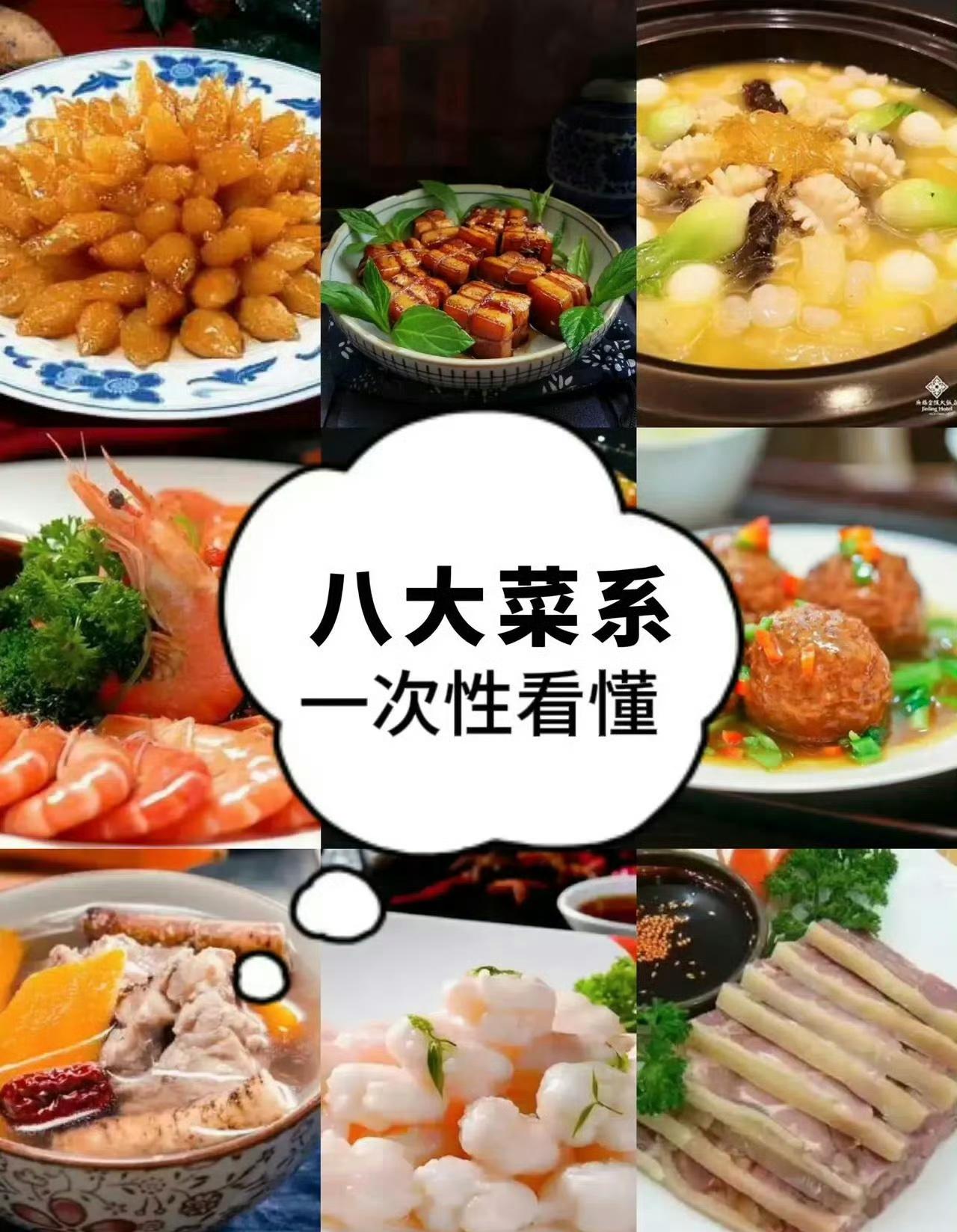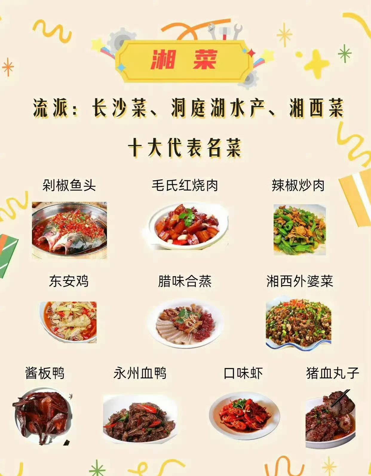 中国举世闻名的十大菜系! 1、 鲁菜:山东糖醋里脊、爆炒腰花等。代表菜:德州扒鸡、糖醋鲤鱼、九转大肠、葱烧海参。 2、湘菜:剁椒鱼头、腊味合蒸、毛氏红烧肉、湘西外婆菜、永州血鸭、东安鸡等。 3、川菜:宫保鸡丁、麻婆豆腐、鱼香肉丝、夫妻肺片、 回锅肉、东坡肘子等。 4、闽菜:佛跳墙、鸡汤入海蚌、白斩河田鸡、淡糟香螺片、武夷熏鹅、荔枝肉等。 5、粤菜:红烧乳鸽、白切鸡、脆皮烧鹅、梅菜扣肉、 老火靓汤、八宝冬瓜盅等。 6、徽菜:虎皮毛豆腐、问政山笋、徽州臭鳜鱼臭鳜鱼、徽州一品锅、黄山炖鸽、方腊鱼等。 7、浙菜:西湖醋鱼、龙井虾仁、三丝敲鱼、宋嫂鱼羹 、荷叶粉蒸肉、雪菜大汤黄鱼等。 8、苏菜:蟹粉狮子头、三套鸭、文思豆腐、干丝松鼠鳜鱼、金陵盐水鸭等。 中华大地幅员辽阔,不同地域的水土孕育出各具特色的饮食文化,其中最负盛名的当属鲁、川、粤、苏、闽、浙、湘、徽八大菜系。它们如同八颗璀璨的明珠,在中华美食的星空中熠熠生辉。 鲁菜作为八大菜系之首,底蕴深厚,依托山东丰富的物产,以葱爆羊肉、葱扒海参等菜品彰显大气醇厚。粤菜则尽显精致,广州菜清鲜、潮州菜味浓、东江菜香浓,龙虎斗、脆皮乳猪等菜品将食材的鲜美发挥到极致。川菜以麻辣鲜香闻名,鱼香肉丝、麻婆豆腐等菜品让人欲罢不能,其独特的调味是四川人对抗潮湿气候的智慧结晶。 湘菜酸辣开胃,麻辣子鸡、辣味合蒸尽显湘人豪爽;闽菜注重刀工与调味,佛跳墙、太极明虾堪称技艺典范;浙菜清鲜脆嫩,西湖醋鱼、龙井虾仁将江南的温婉融入菜品;苏菜细腻雅致,松鼠桂鱼、盐水鸭尽显淮扬风味;徽菜重油重色重火工,红烧果子狸、火腿炖甲鱼等菜品散发着山野气息。 这些菜系不仅是味蕾的盛宴,更是地域文化的生动载体,每一口都饱含着一方水土的独特韵味。