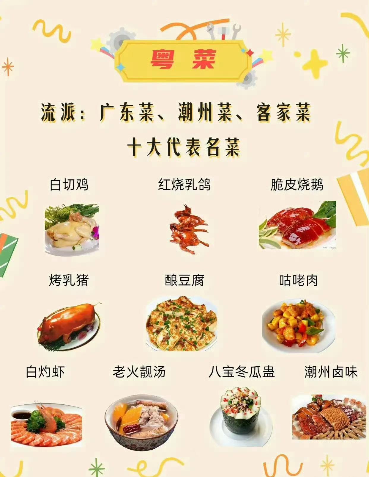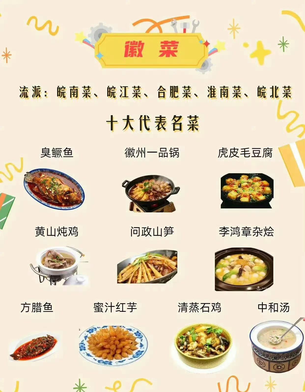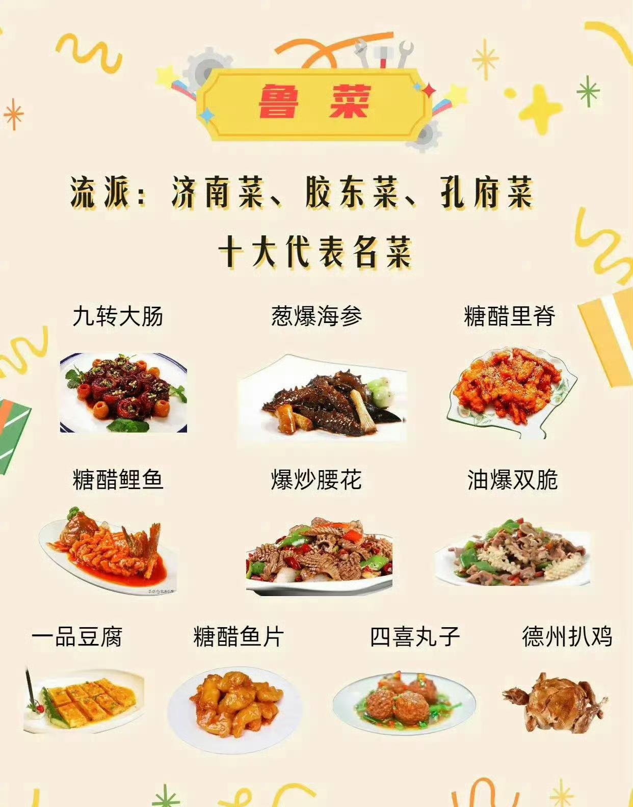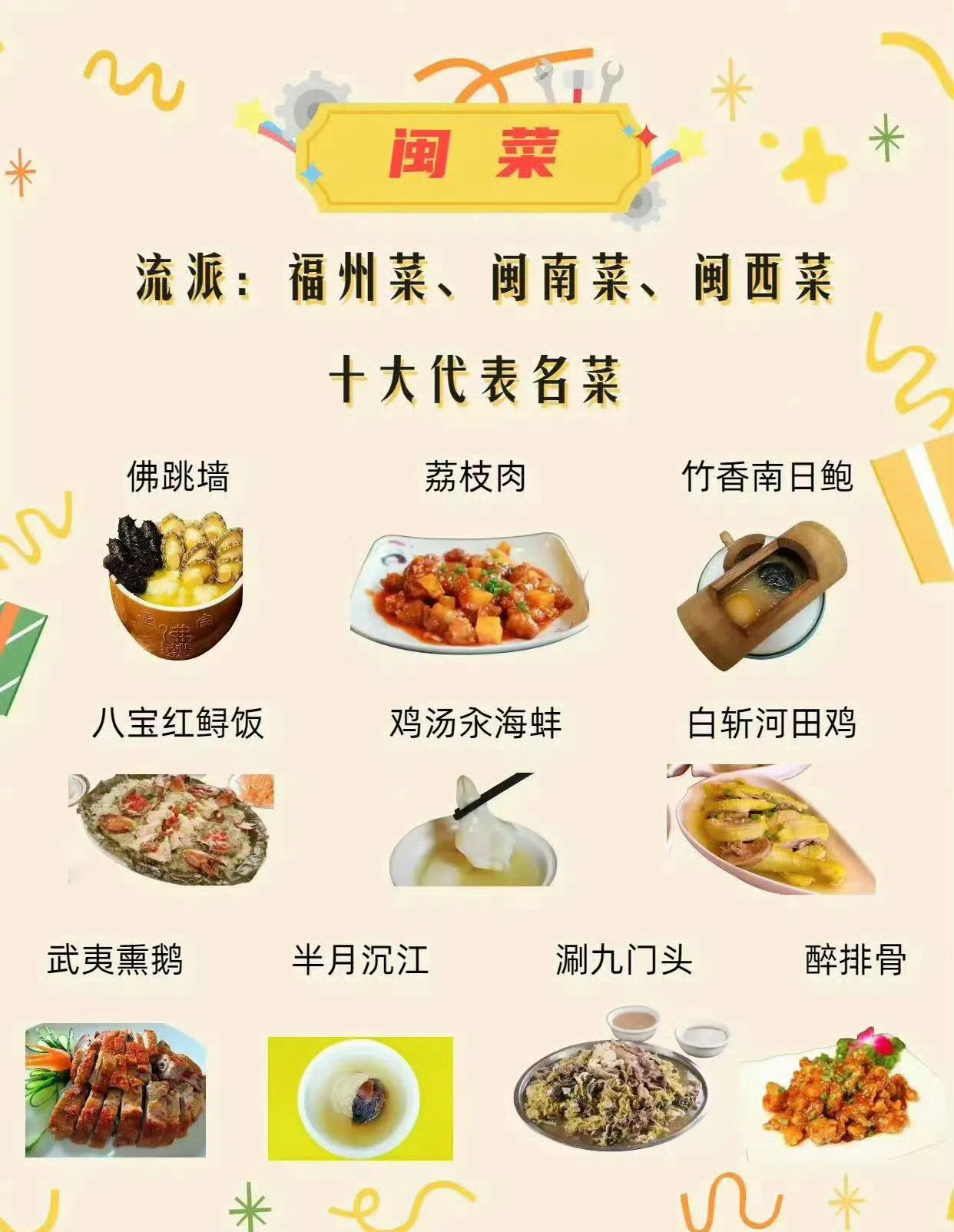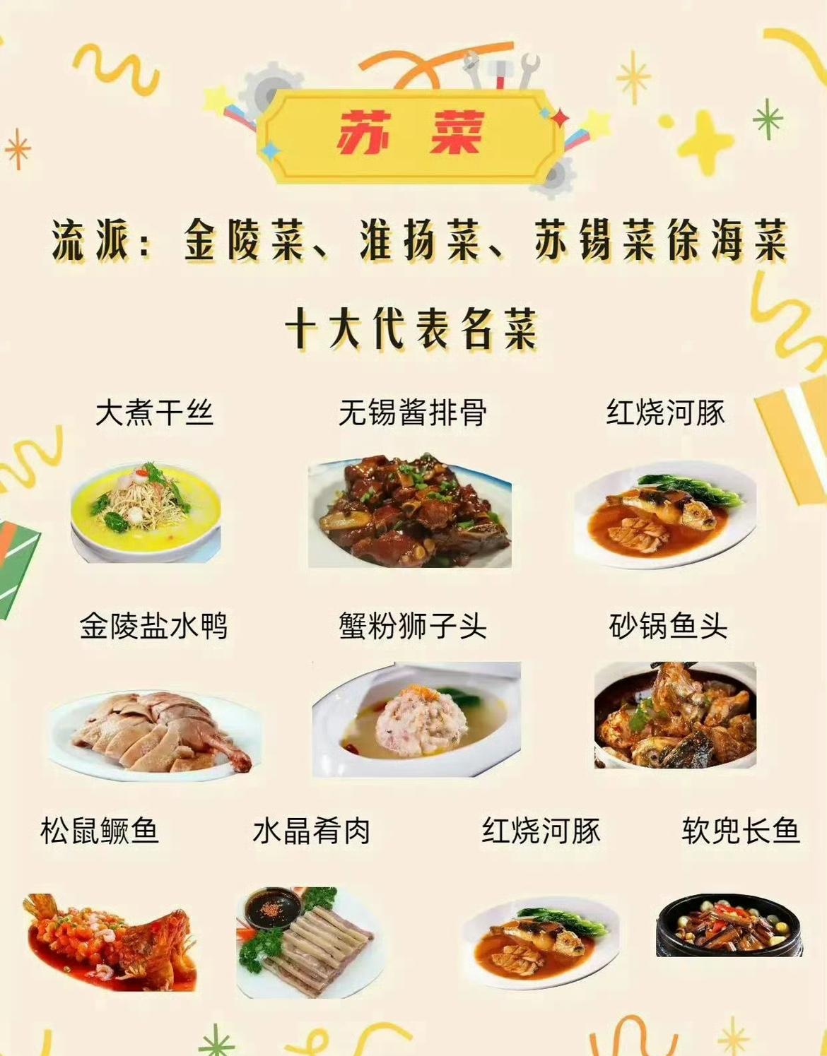 中国举世闻名的十大菜系! 1、 鲁菜:山东糖醋里脊、爆炒腰花等。代表菜:德州扒鸡、糖醋鲤鱼、九转大肠、葱烧海参。 2、湘菜:剁椒鱼头、腊味合蒸、毛氏红烧肉、湘西外婆菜、永州血鸭、东安鸡等。 3、川菜:宫保鸡丁、麻婆豆腐、鱼香肉丝、夫妻肺片、 回锅肉、东坡肘子等。 4、闽菜:佛跳墙、鸡汤入海蚌、白斩河田鸡、淡糟香螺片、武夷熏鹅、荔枝肉等。 5、粤菜:红烧乳鸽、白切鸡、脆皮烧鹅、梅菜扣肉、 老火靓汤、八宝冬瓜盅等。 6、徽菜:虎皮毛豆腐、问政山笋、徽州臭鳜鱼臭鳜鱼、徽州一品锅、黄山炖鸽、方腊鱼等。 7、浙菜:西湖醋鱼、龙井虾仁、三丝敲鱼、宋嫂鱼羹 、荷叶粉蒸肉、雪菜大汤黄鱼等。 8、苏菜:蟹粉狮子头、三套鸭、文思豆腐、干丝松鼠鳜鱼、金陵盐水鸭等。 中华大地幅员辽阔,不同地域的水土孕育出各具特色的饮食文化,其中最负盛名的当属鲁、川、粤、苏、闽、浙、湘、徽八大菜系。它们如同八颗璀璨的明珠,在中华美食的星空中熠熠生辉。 鲁菜作为八大菜系之首,底蕴深厚,依托山东丰富的物产,以葱爆羊肉、葱扒海参等菜品彰显大气醇厚。粤菜则尽显精致,广州菜清鲜、潮州菜味浓、东江菜香浓,龙虎斗、脆皮乳猪等菜品将食材的鲜美发挥到极致。川菜以麻辣鲜香闻名,鱼香肉丝、麻婆豆腐等菜品让人欲罢不能,其独特的调味是四川人对抗潮湿气候的智慧结晶。 湘菜酸辣开胃,麻辣子鸡、辣味合蒸尽显湘人豪爽;闽菜注重刀工与调味,佛跳墙、太极明虾堪称技艺典范;浙菜清鲜脆嫩,西湖醋鱼、龙井虾仁将江南的温婉融入菜品;苏菜细腻雅致,松鼠桂鱼、盐水鸭尽显淮扬风味;徽菜重油重色重火工,红烧果子狸、火腿炖甲鱼等菜品散发着山野气息。 这些菜系不仅是味蕾的盛宴,更是地域文化的生动载体,每一口都饱含着一方水土的独特韵味。