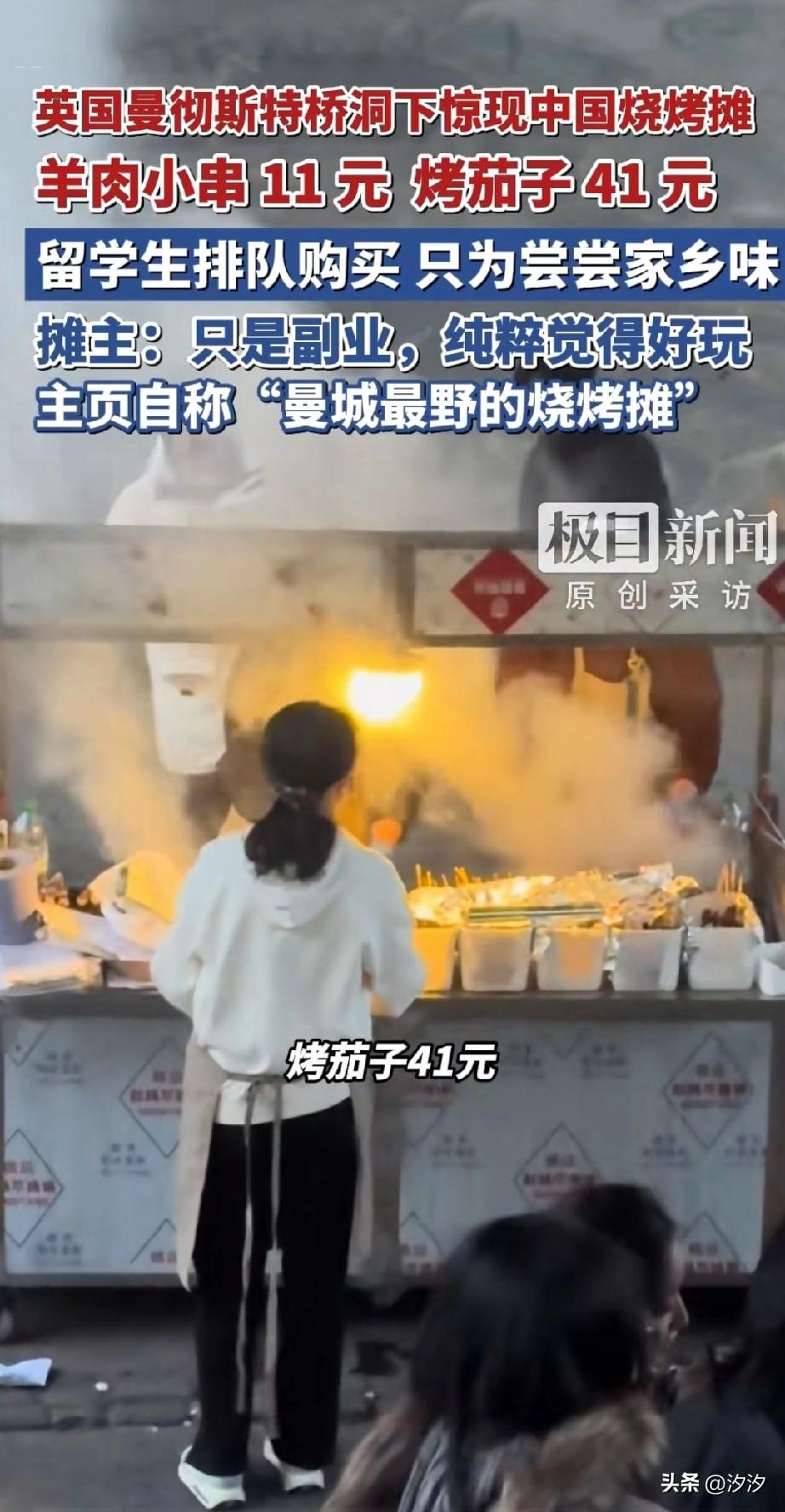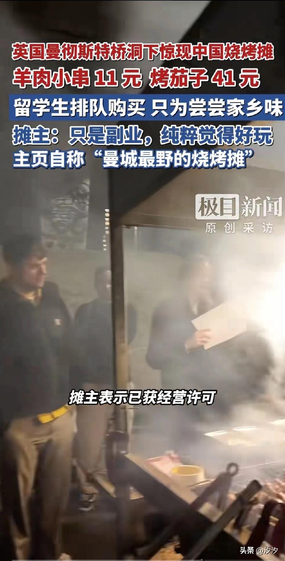 英国曼彻斯特居然也有烧烤摊, 而且还是在一座大桥的下面, 摊主说自己摆摊有三年, 做这个完全就是爱好, 想让大家尝尝家乡的味道, 来这里捧场的大多都是留学生, 当然也有很多好奇的老外, 他们也是来尝尝鲜, 11块钱的一串羊肉串, 41块钱的是烤茄子, 卖的非常的好, 摊主还在社交平台上开通了账号, 叫做挚友烧烤摊, 并且人家还是有营业执照的, 怪不得能摆摊这么多年, 现在生意很不错, 估计夏天生意很火爆, 烧烤摊配上啤酒, 简直就是绝配了! 钟爱异国美食 曼彻斯特必吃榜 烤鸡摊 曼彻斯特烧烤 曼彻斯特手抓饼