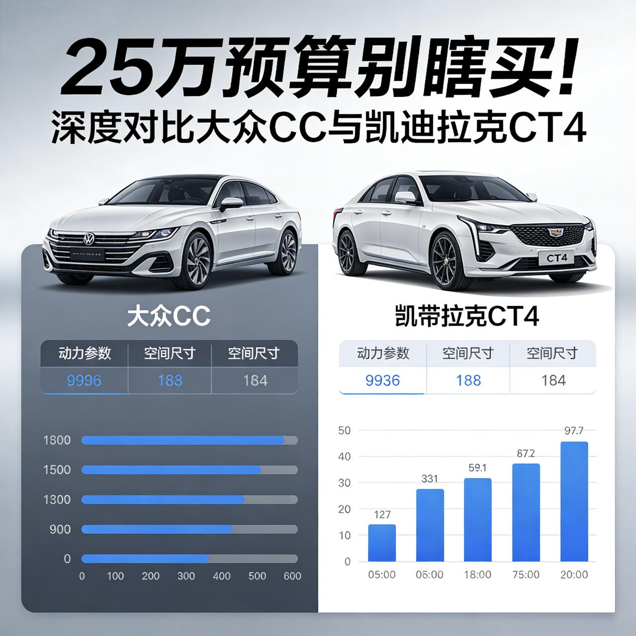 25万预算别瞎买!深度对比大众CC与凯迪拉克CT4:一个顾家,一个顾自己 最近后台好多兄弟问我,手里攥着25万左右的预算,想要点个性,不想随大流买雅阁凯美瑞,看上了“最美大众”CC和“洗浴小王子”CT4,问我到底该选哪个? 正好,趁着这次活动,我把这两台车都借了出来,而且是开了一整天的那种深度体验,不是去4S店摸摸方向盘就完事。从市区堵车到高速狂奔,甚至专门找了段山路劈弯。 两台车开下来,我发现它们虽然价格重叠,但骨子里的性格简直是两个世界的人。今天就跟大家掏心窝子聊聊,看完你心里就有数了。 第一印象:面子给谁看? 先说大众CC。这车往那一停,确实是帅。无框车门一开,大溜背一瞅,那种优雅感是CT4给不了你的。路人可能觉得你开的是一辆三四十万的车。而且它的后备箱是掀背式的,开口巨大,我试了下,放个婴儿车或者去宜家买个家具,根本不用愁,这车说白了,是给家里人看的,面子里子都照顾到了。 再看凯迪拉克CT4,线条硬邦邦的,像个小钢炮,棱角分明,加上那对獠牙式大灯,看着就不好惹。但它的后排空间真的很局促,我1米78坐进去,头发快扫到顶了,腿部也就一拳。这车是给你自己爽的,坐进驾驶位那一刻,你就知道,后排能放包就行,坐人?那是应急的。 驾驶感受:一个像轨道车,一个像卡丁车 这是两台车分歧最大的地方,也是我今天重点想说的。 先开的大众CC,380TSI版本,220匹马力,匹配的是7速湿式双离合变速箱。这套动力总成在市区开,给你的感觉就是“德味十足”——平顺、跟脚,换挡快到你几乎感觉不到。方向盘很轻,一只手就能轻松揉库,底盘很整,过减速带是“咚咚”两声,干脆利落,不会有多余的晃动。 但是,当我把它开上山路,或者想激烈驾驶一把的时候,前驱车的物理瓶颈就出来了。入弯稍微快一点,车头就有点推,你得收油等它。虽然它跑高速稳得像吸在地上,但在弯道里,它更像一个规规矩矩的“轨道车”,虽然快,但少了点乐趣。 换到CT4,那一瞬间,我感觉自己年轻了五岁。2.0T的机头,237匹马力,匹配的是8速手自一体变速箱。参数比CC高一点,但体感上猛得不止一点。后驱的魅力就在这儿。 在同一个弯道,CC在推头,CT4你可以含着油门过,车尾会微微地往外推着你入弯,那种感觉太上头了。方向盘也重手很多,路感极其清晰,压过一颗小石子你都能感觉到。它就像个灵活的卡丁车,指哪打哪。虽然这套8AT在低速偶尔会有一点点闯动,但这并不影响它带给你的那种“人车合一”的快感。 两台车的动力总成性格也很分明: CC的双离合追求的是平顺和效率,日常开很舒服;CT4的AT变速箱则更愿意拉高转速,时刻准备着给你动力响应。 开久了,你才会明白的事 如果只看第一印象,可能很多人会被CC的颜值吸引。但当你开上几天,细节的差异就出来了。 大众CC的“高级感” 体现在它的均衡。内饰虽然是大众祖传风格,但10.3英寸的全液晶仪表盘看着就是舒服,座椅的包裹性很好,长途驾驶腰不酸。油耗也比较友好,市区综合也就9个左右。它像一个精打细算的管家,什么都给你安排得明明白白。 CT4的“纯粹感” 则需要你付出一点代价。为了后驱布局,它牺牲了后排空间;为了运动操控,底盘硬得让你过减速带必须减速到10km/h以下,不然屁股疼。而且油耗略高,美系车的粗犷在这时候就暴露了。但它有Bose音响,有主动降噪,关上车窗,那就是你的世界。它像一个热血沸腾的兄弟,时刻陪你疯,但不太会照顾人。 我的建议 这两台车没有绝对的好坏,只有合不合适。 如果你刚结婚,或者家里只有一台车,甚至准备要小孩,别犹豫,选大众CC。它的掀背尾门能装下你的婴儿车,它的后排能让丈母娘坐得舒服,它的无框车门也能满足你那一点点的虚荣心。 如果你单身,或者家里已经有了一台SUV或MPV,这车纯粹是你买来玩的,甚至是你的第一台后驱车,那闭眼入凯迪拉克CT4。趁年轻,体会一下什么叫大马力后驱,什么叫弯道里的可控甩尾。等到35岁以后,你可能就只想安安稳稳开CC了。 最后说句实在话,选车就是选生活。问问你自己:这辆车,到底是为家人的舒适买单,还是为自己的快乐买单?【来自懂车帝车友圈】