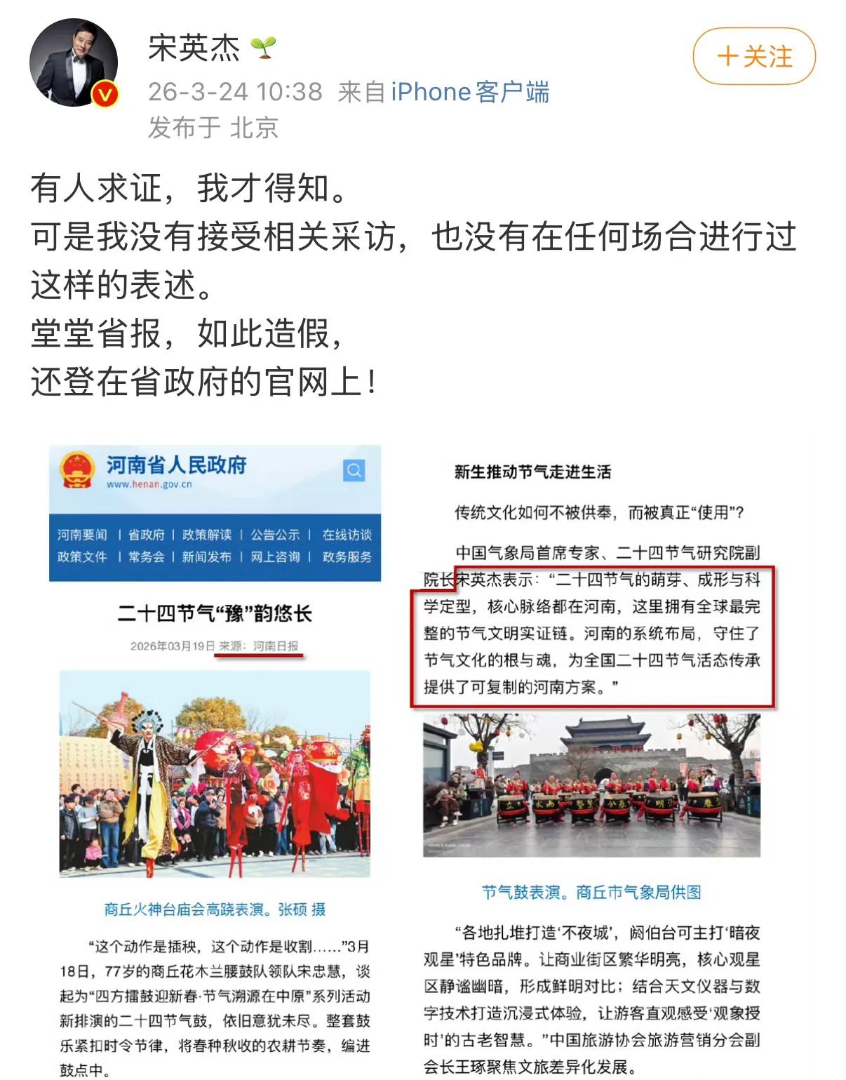 《河南日报》为了显示二十四节气是在河南起源与传承的,特地引用中国气象局首席专家宋英杰的话来证明“河南守住了二十四节气文化的根和魂”。 结果,宋英杰发博公开澄清:“那段话没有学术证据支撑,并且是我特别反对的排他性表述。如果河南日报认为是我说过的话,需要提供证据。” 堂堂省报……如何在《河南日报》上发个人访谈 造谣