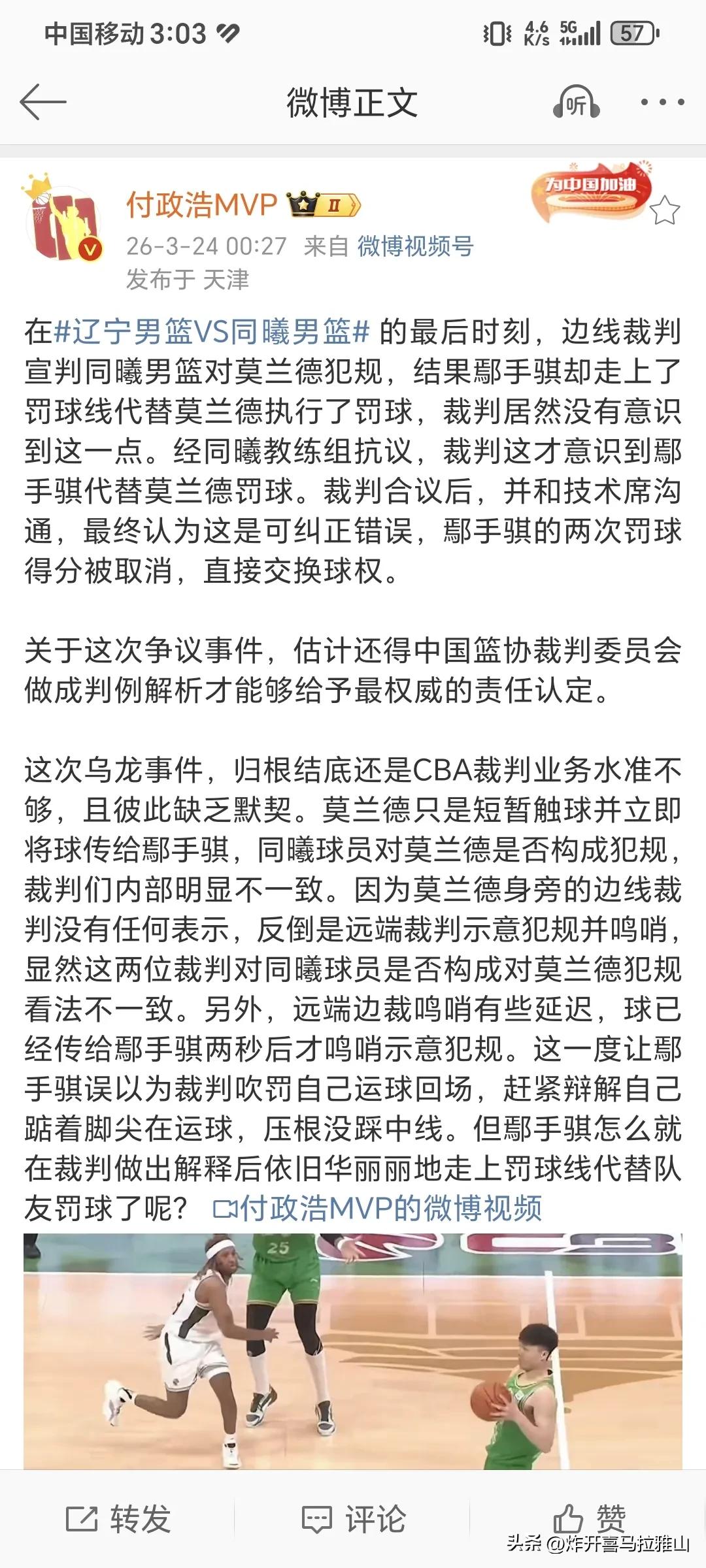 裁判一个误判原来是三方博弈,裁判将错就错,辽宁队占便宜不吱声,南京同曦队螳螂捕蝉黄雀在后,赛后这个裁判肯定会被处理的。 原本是裁判误判了鄢手骐踩了中线,可是哨子响了以后一看鄢手骐踮脚了,根本就没有踩到线,结果裁判将错就错就,把哨子转移到两秒前南京同曦队小外援对莫兰德的犯规上。球在鄢手骐手里响的哨子,鄢手骐上罚球线罚球裁判也没有异议。 南京同曦队也是憋着坏了,等辽宁队完成罚球后立马投诉裁判辽宁队罚球球员错误,裁判也没理不硬气,不仅立即取消了辽宁队所得的2分,还将球权判给了南京同曦队,里外里差了4分以上。 只能说南京同曦队早就发现了这个错误,利用裁判将错就错的心理去让自己的球队受益。不得不说这也是一种聪明。手帝和辽宁队还是太年轻了,以为这么容易得2次罚球闷声发大财就不说了,结果螳螂捕蝉黄雀在后,差点让自己翻车[捂脸][捂脸][捂脸][捂脸]。