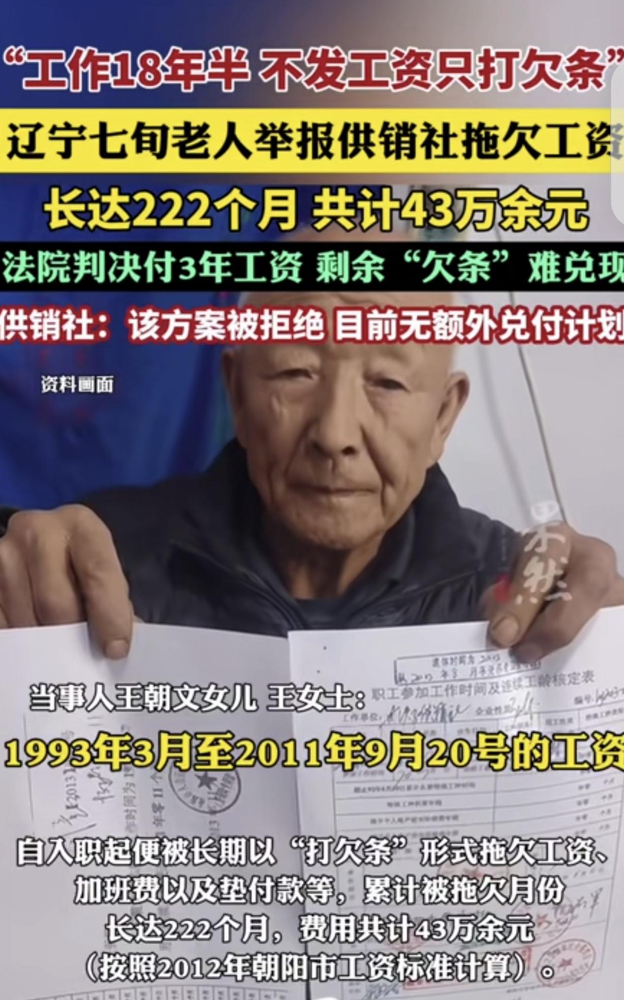 辽宁,一7旬大爷,在供销社上班18年,供销社不发工资,只打欠条,欠了222个月工资累计43万多元,大爷一气之下把供销社告了,法院判决供销社给大爷3年工资,剩下的打了欠条,大爷坚决不同意,2026年供销社又挤牙膏一样,要给大爷3万,大爷崩溃了! 王大爷1993年,调入当地某供销合作社工作。 他把这份工作看成铁饭碗,可以说干的很卖力,起早贪黑,从不迟到早退。 在王大爷看来,这是一份稳定的工作,他得靠着这份收入,养儿育女。 他要把这工作,安安稳稳地干到退休,把孩子们养大成人,给父母养老送终,帮着儿女成家立业,完成任务,他和老伴颐养天年。 可没想到,从入职那天起,供销社一到发工资,不给现钱,用打欠条的形式拖欠他的工资。 不仅如此,加班费以及他平时为工作垫付的款项,也都被拖欠着。 王大爷上班挣钱是为了养家糊口,可辛苦干一个月,他拿不到钱不说,还要往里搭钱,这是什么事呀?他也搭不起呀! 可不给结工资,他只能硬着头皮继续干,工资一拖就是18年,累计下来,被拖欠的月份竟然长达222个月,费用总计高达43万多元。 王大爷有苦说不出呀,他只是个普通人,每个月就指着那点工资过日子,供销社这么一拖,他的生活变得捉襟见肘。 为了讨回自己的血汗钱,王大爷多次找到供销社的负责人,苦苦哀求他们能把拖欠的工资结清。 可每次得到的答复都是再等等,供销社资金紧张,等有钱了一定给。王大爷信以为真,一等就是好多年。 眼看着自己年纪越来越大,身体也不如从前,可工资还是一分都没拿到,王大爷心急如焚。 2010年,在多次讨薪无果后,王大爷一气之下,把供销社告上了法庭。 这场官司一打就是好几年,2013年,二审法院有了判决结果。 法院认定王大爷和供销社之间的劳动关系存在的,但由于供销社改制、待业协议等各种原因,劳动关系中间就断了。 而且,王大爷有的诉求,也超过了诉讼时效,最终只判决供销社支付王大爷3年的工资。 王大爷对这个判决结果十分不服,他觉得自己的辛苦钱不该就这么打水漂。 于是,他又四处奔走,反映自己的情况。 2018年,经过协调,确认了王大爷在供销社的工作时长为18.5年,并且约定要核算他的欠薪情况,可这一约定却始终没能执行下去。 时间来到了2026年,供销社终于提出了一个解决方案,愿意给王大爷3万多元。 但这和王大爷核算的金额差的不是一星半点,如果接受了,就等于这么多年白干了。 王大爷一口回绝,而供销社却回应称,法院判决支付3年工资,但王大爷不同意,那就没办法了。 这件事看得人心里堵得慌,王大爷半辈子的血汗都耗在供销社了,辛辛苦苦干了快19年,到头来拿着一摞欠条要不回来钱,搁谁身上能不崩溃? 就算有法院判决、有部门协调的工龄认定,供销社也能说不认就不认,43万的欠薪只肯给3万,这明摆着是欺负老实人。 要是连白纸黑字的欠条、盖了章的工作记录都作不了数,普通劳动者的权益谁来保障? 现在王大爷已经70多了,耗了这么多年,真等不起了,别让老人到最后既亏了钱又寒了心。 《保障农民工工资支付条例》第29条规定,建设单位应当按照合同约定及时拨付工程款,并将人工费用及时足额拨付至农民工工资专用账户,加强对施工总承包单位按时足额支付农民工工资的监督。 虽王大爷属于供销社职工,但欠薪本质同样属于劳动报酬拖欠,可参照该条例的欠薪处置原则,当地应介入核查欠薪事实,督促供销社制定合理兑付方案,不能以时效、协议未落地为借口逃避责任。 对此,你怎么看?