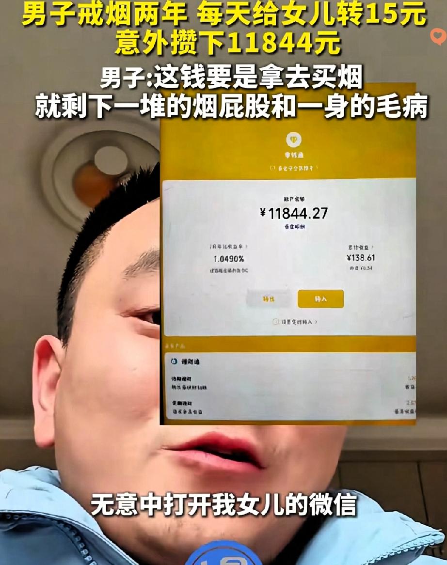 谁懂啊! 这戒烟方法简直绝了! 10多年烟龄的周先生,没喊口号没嚼口香糖,每天给女儿转15块烟钱,坚持2年居然把烟戒了,还攒下11844元“巨款”! 以前他烟瘾大到一天一包,躲厕所躲楼下抽,家人跟着吸二手烟。 后来公司裁员降薪,看着每月抽烟的开销,他突然心疼了。 这招太高明了,把烟钱转给女儿,暗示自己“抽过了”,烟瘾犯了就按根数转钱,把欲望变成了储蓄的动力。 比起硬扛的苦逼戒烟法,这种把“花钱习惯”换成“存钱目标”的思路,才是普通人能坚持下来的王道。 戒烟不是靠毅力死磕,而是找对方法,把自律变成看得见的收益。 你身边有没有人用过这种“花式戒烟法”?