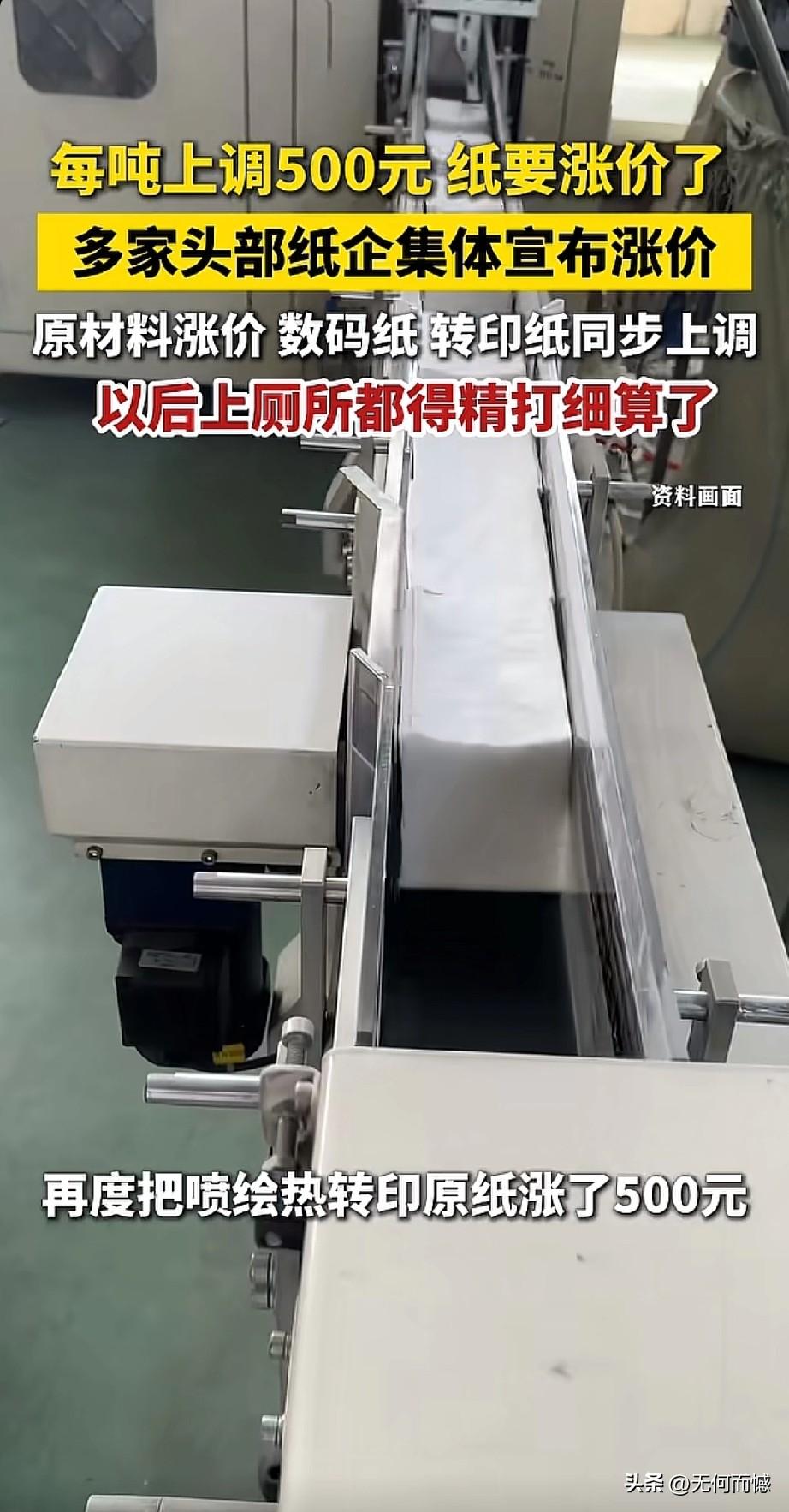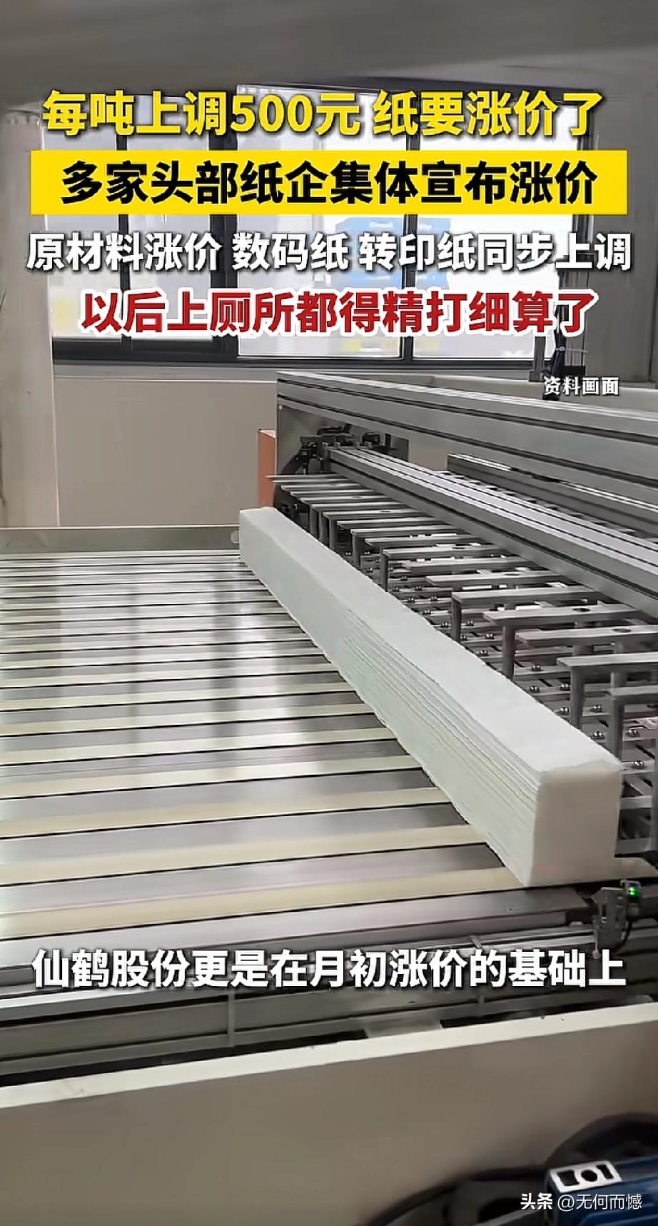纸价又涨了,以后上厕所都得精打细算啦!最近国内好几家头部纸企集体官宣涨价,太阳纸业、五洲特纸的数码纸,还有仙鹤股份的喷绘热转印原纸,每吨直接上调500块!仙鹤股份更狠,这月都涨两回了,累计涨了1000块/吨!为啥涨?说白了就是原材料涨价闹的,海外纸浆减产又涨价,成本压得纸企喘不过气,只能往终端传导。虽说这次涨价主要是数码纸、转印纸这些特种纸,但架不住大伙担心啊,连“以后上厕所都得精打细算”的段子都出来了。这波涨价潮不光影响印刷、广告这些行业,说不定哪天生活用纸也得跟着涨,咱老百姓的钱包又得紧一紧了,可得提前做好准备!