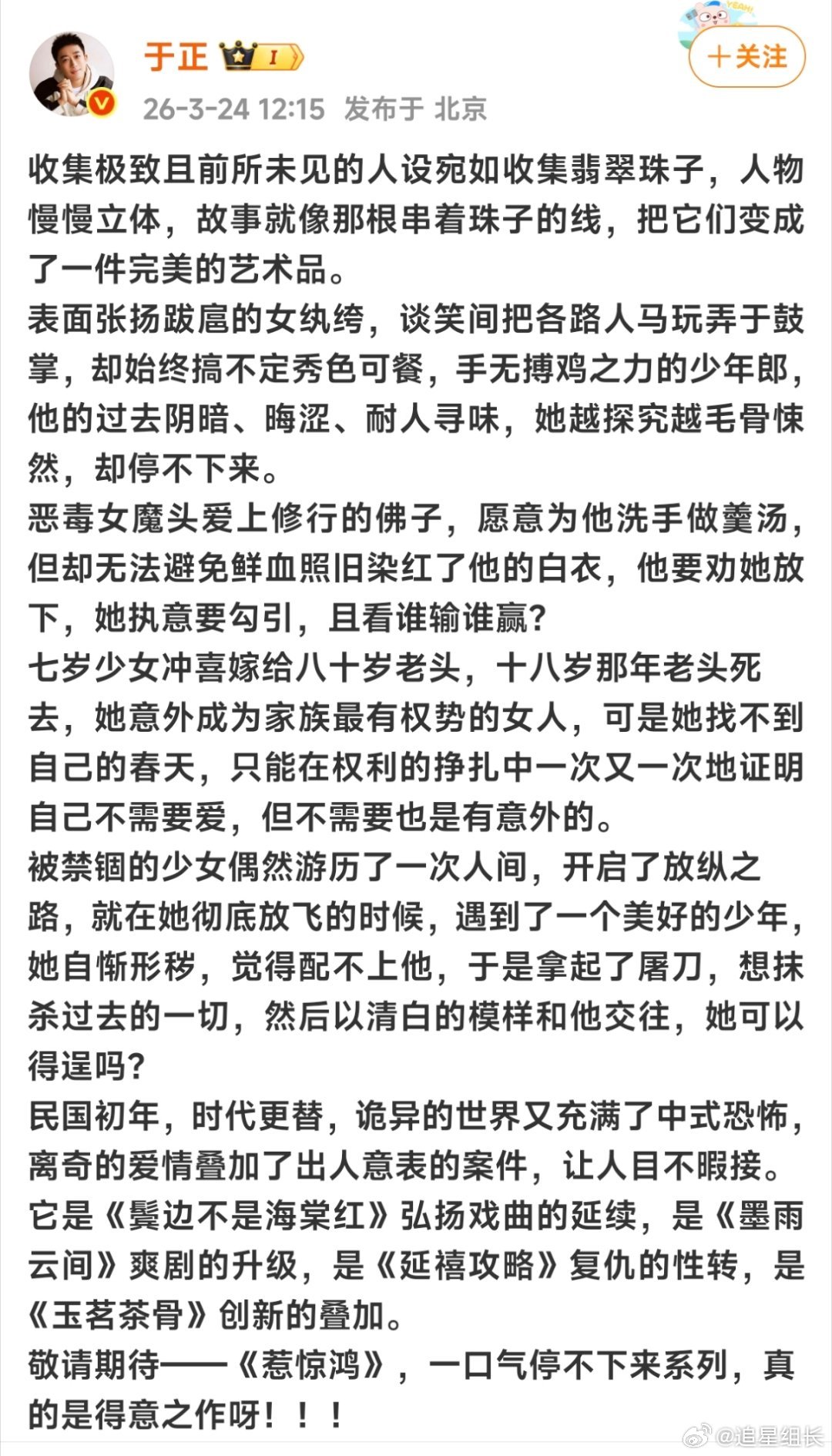 于正宣传惹惊鸿 胃口被吊足了!《惹惊鸿》里,女纨绔搞不定手无缚鸡之力的少年郎,恶女魔头恋上佛子却难逃鲜血染白衣,七岁冲喜少女十八岁守寡在权力中挣扎,禁锢少女为爱拿起屠刀抹杀过去。民国中式恐怖叠加离奇爱情,既是《鬓边》戏曲延续,也是《墨雨》爽剧升级、《延禧》复仇性转、《玉茗》创新叠加。一口气停不下来,于正得意之作,狠狠期待了!