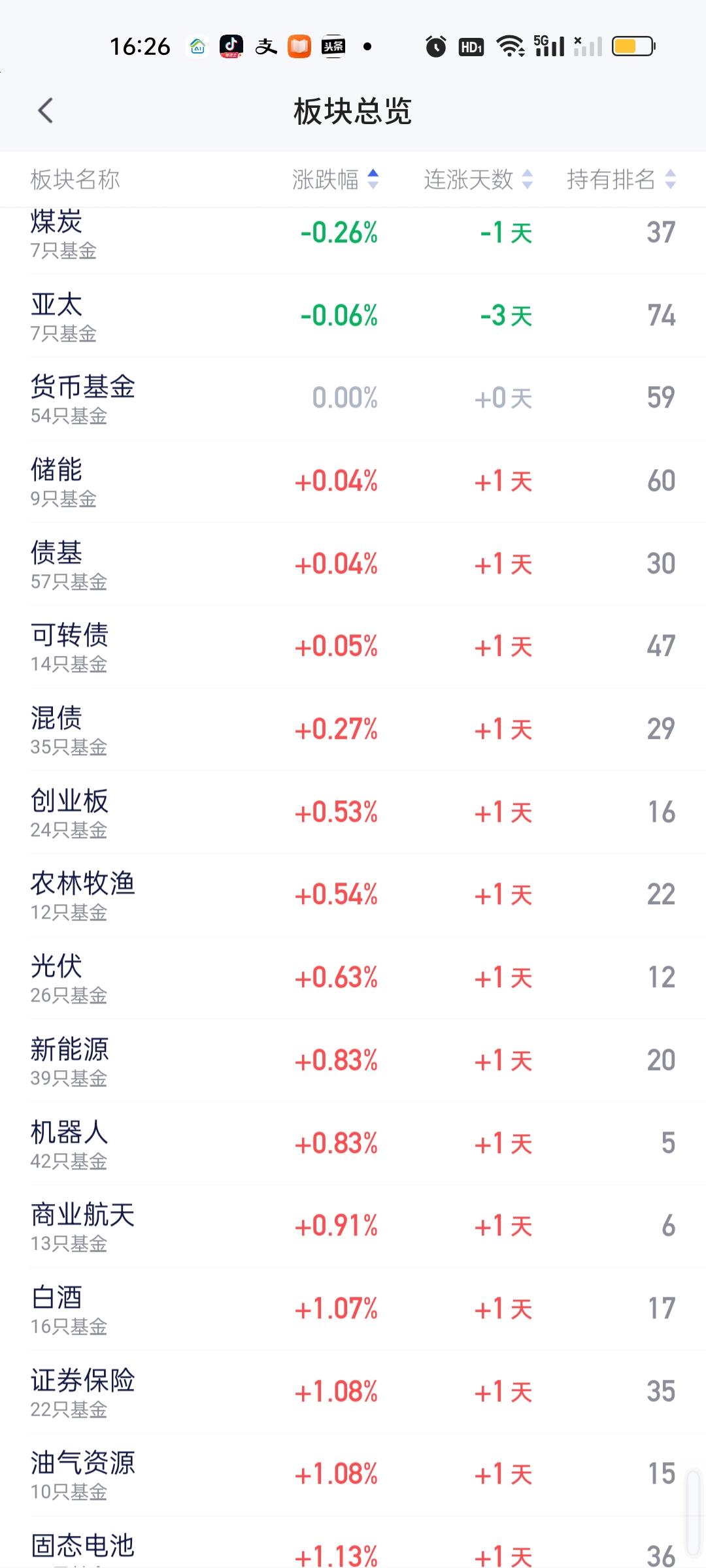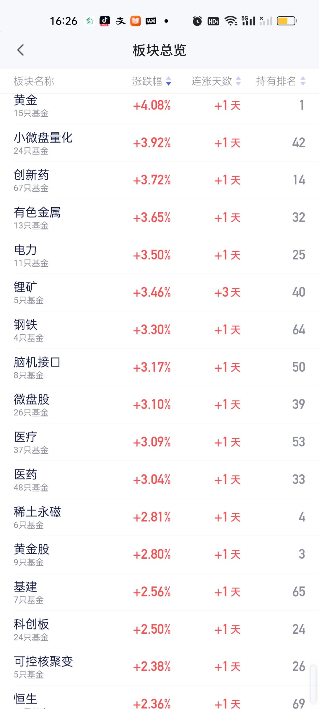 今天和昨天完全相反,今天只有两个板块是下跌的,几乎所有板块都是红的,但涨幅最大的并不是科技板块,而是黄金和小微盘量化,创新药,有色金属,电力,锂矿,钢铁,脑机接口,微盘股,医疗,医药和稀土永磁。不知道明天会不会轮到科技上涨。按照道理风水轮流转,轮也要轮到科技了。