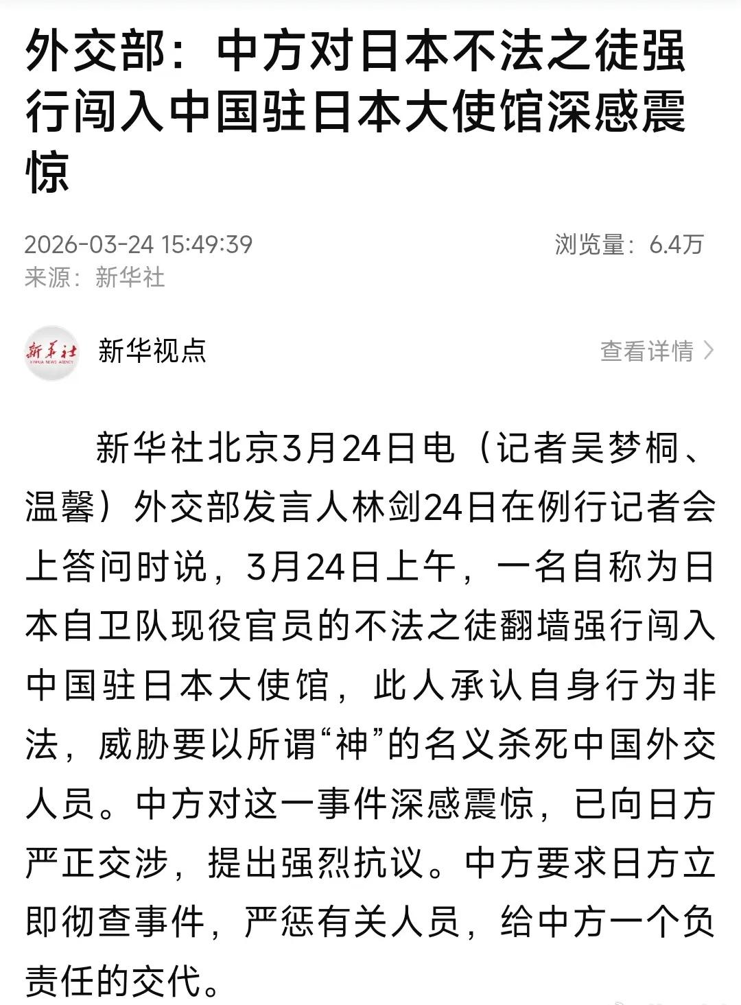 外交部:中方对日本不法之徒强行闯入中国驻日本大使馆深感震惊! 日本这种极右翼军国主义思维传播,然后信息茧房又认为日本比中国强。这小日子简直疯了。 外交部发言人林剑24日在例行记者会上答问时说,3月24日上午,一名自称为日本自卫队现役官员的不法之徒翻墙强行闯入中国驻日本大使馆,此人承认自身行为非法,威胁要以所谓“神”的名义杀死中国外交人员。中方对这一事件深感震惊,已向日方严正交涉,提出强烈抗议。中方要求日方立即彻查事件,严惩有关人员,给中方一个负责任的交代。
