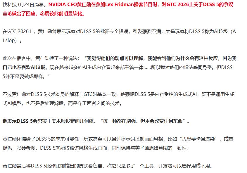 据了解,近期在一档播客节目里,黄仁勋再次提到了此前的DLLS 5争议。