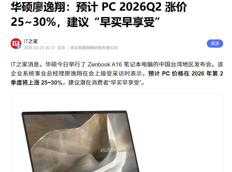 据了解,近期华硕高管廖逸翔在 Zenbook A16发布会上表示:预计 PC 价格在 2026 年底 2 季度将上涨 25~30%,建议潜在消费者“早买早享受”。