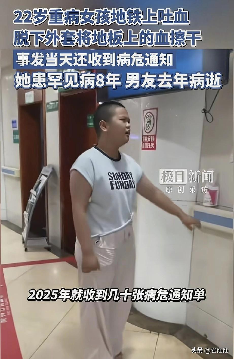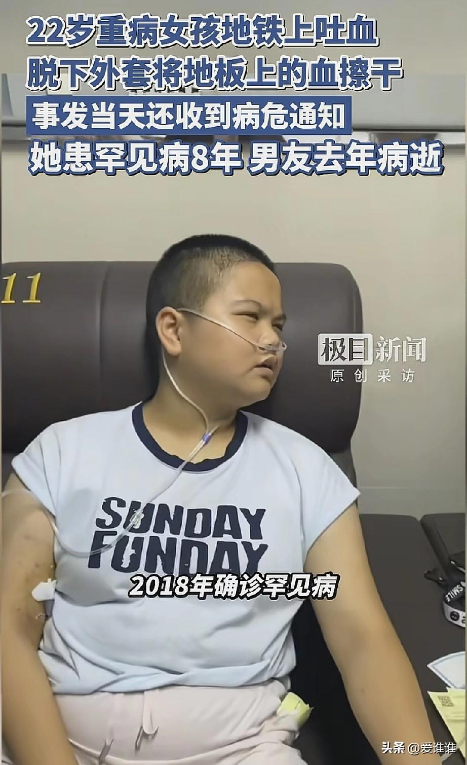 “让人心疼的女孩!”3月23日下午,重庆地铁1号线上,一个瘦弱的女孩蹲在车厢里,脱掉身上的外套擦地刚吐的血迹,她手上还扎着留置针,擦几下就得歇一歇。 这个女孩叫胡心瑶,今年22岁,她刚从医院出来,又收到了一张病危通知单,坐地铁回家的路上,她突然吐血了,她怕血被人踩到,身边又没有纸巾,就把自己最喜欢的那件外套脱下来,一点一点把地板擦干净。 有乘客拍下了这一幕,传到网上后无数人看哭了。 胡心瑶从14岁就开始生病,这些年确诊了一种叫ANCA相关性血管炎的罕见病,身体里的免疫系统会攻击自己的血管,慢慢伤到肾和肺,8年来她已经花了180多万,光病危通知单就收了40多张,她的父母都70多岁了,在老家种地,这些年她几乎都是一个人扛着。 她曾经有个男朋友,跟她求过两次婚她都拒绝了,怕拖累人家,后来男朋友因为急性胰腺炎去世了,临终前把攒的5万块钱留给她,让她建一个“病友之家”,帮帮和她一样的病人,她用这笔钱真的把“鹿灵瑶病友之家”办了起来。 为了凑钱治病,她一天打几份工,做心理咨询、卖果汁、写小说,经常忙到凌晨,她说现在最大的愿望就是“能够活下去”! 3月24日凌晨,在好心人的帮助下,她已经转到华西医院抢救,网友说的一句话很多人都认同:自己都快站不住了,还在替别人着想,这姑娘懂事得让人心疼!
