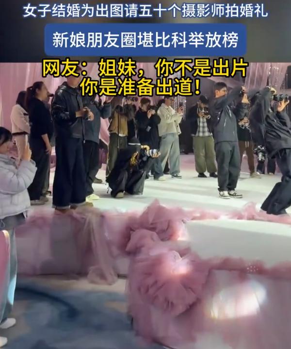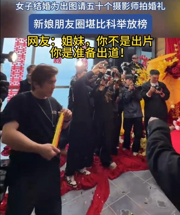 有钱任性!吉林,一女子结婚,为了让自己在婚礼当天更加出彩,留下更好的照片纪念,她竟然一口气请了50位摄影师,各个角度拍摄,知道的是结婚,不知道的还以为那个明星来走红毯呢。网友:这是准备出道啊? 从婚礼现场来看,确实够夸张的,新娘走在前面,50位摄影师齐刷刷地拿着相机跟在身后,而且每到一个场景或者换了一套衣服,都要摆上poss拍上好久,那架势就跟明星出席电影节一样 有人说这是有钱任性,也有人直接开怼,说毫无意义,顺带还举了个例子,说自己同学当年专门飞美国拍婚纱照,结果最后还是离了。言下之意很明显,整这些虚头巴脑的没用,婚姻好不好,跟拍了多少照片没半毛钱关系 但说实话,这么比也挺没意思的。离婚这事儿原因多了去了,跟当年在哪儿拍婚纱照真没啥必然联系。总不能说,因为拍了贵价婚纱照所以离婚,那不拍的就都能白头偕老?逻辑上说不通 其实冷静下来想想,这事儿也没那么复杂。结婚嘛,一辈子大概率就一次,对很多人来说,这就是人生里最大的高光时刻。有人喜欢热闹,有人喜欢排场,有人就是想把这一天弄得特别点,留点好东西以后慢慢翻。说白了,这50个摄影师,请的不是摄影师,是那份我觉得自己今天很重要的心情 至于值不值,那就看从哪个角度说了。从实用性角度看,确实用不了50个人,三五个顶配团队足够把每个角度都照顾得明明白白。但从情绪价值的角度说,人家花自己的钱,图自己高兴,又不碍着谁,那就没什么好指摘的 再说了,现在结婚这件事,本身就越来越像一场个人发布会。婚礼的流程、布置、环节,本质上都是在表达我是谁、我喜欢什么、我想让大家看到什么。请50个摄影师,无非是把这个表达做得更极致了一点。你可以觉得夸张,但人家也没求着谁掏钱 真要说什么叫虚荣,什么叫实在,其实界限挺模糊的。有人觉得花大钱请摄影师是虚荣,可转头自己买个几万块的包发朋友圈,性质上有多大区别?说到底,人活一辈子,谁还没点想在重要时刻被看见、被记录的心思呢。