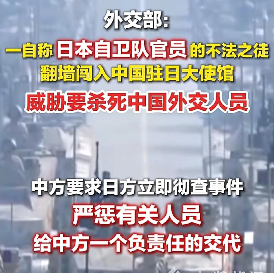 我看完这个新闻真的气炸了,这已经不是普通的寻衅滋事了,这是公然践踏中国主权! 中国驻日本大使馆是什么地方?那是国际法承认的中国领土,神圣不可侵犯,结果一个日本自卫队现役官员,居然直接翻墙闯进去,还放话要“以神的名义杀死中国外交人员”,这不是疯了,这叫有恃无恐。 你细想就知道有多可怕:他是现役自卫队官员,不是什么街头流浪汉,为什么能精准摸到中国大使馆翻墙?为什么日本的安保人员没拦住? 为什么他敢公然喊出杀人的话?这根本不是什么个人极端行为,这就是日本国内极右翼势力猖獗到敢直接挑衅中国底线的实证。 外交部说的一点没错,这事已经严重违反《维也纳外交关系公约》,日本政府对自卫队人员失管失教的锅是甩不掉的。之前日本还天天喊着要“正常国家”,要扩军,现在连自己的现役军人都管不住,敢直接闯外国大使馆杀人,这就是你们要的“正常” 之前我还看到日本有人说什么“就是个疯子个人行为,没必要上纲上线”! 但是最近日本国内什么风向我们还能不清楚吗?修改和平宪法,往钓鱼岛派自卫队,跟美国搞联合军演针对中国,现在连现役军人都敢直接闯中国使馆了,这是偶然吗?就像是在一步步试探底线罢了。 这事必须要日方给个彻彻底底的交代,不仅要严惩这个行凶的人,还要给我们一个保障,以后不会再发生这种事,外交人员的生命安全是底线,半分都让不得!