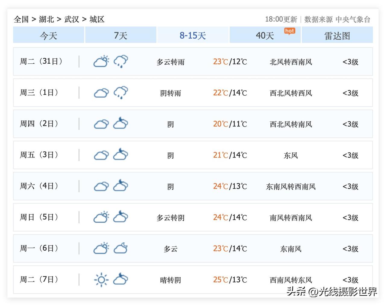 喜从天降!3月25日到31日,湖北武汉市,经常出太阳!这周末,武汉出太阳,非常适合去武汉大学看樱花!中央气象台的最新天气预报显示,3月25日,星期三白天,武汉多云…… 3月27日,星期五,武汉多云。 3月28日,星期六,武汉多云。 …… 3月30日,星期一,武汉晴转多云。 真没想到,武汉天气,接下来普遍都很不错,非常适合踏青赏花,武汉植物园,解放公园……最近百花盛开,真的好美啊! 3月底的武汉天气,让人惊喜,让人开心!