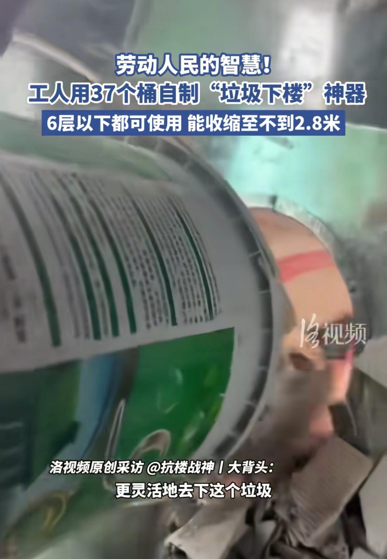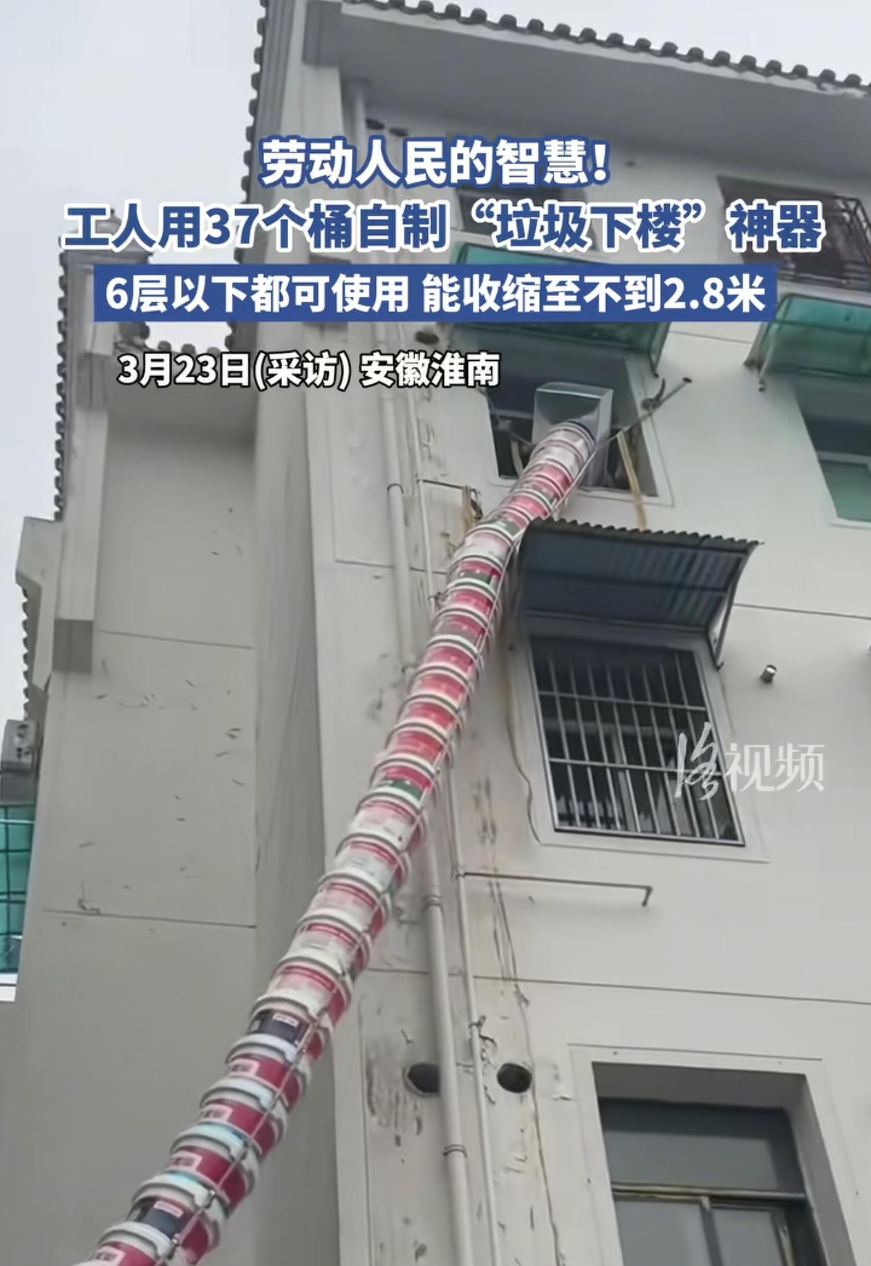 “劳动人民的智慧!”安徽淮南,工人装修房子时,总觉得来回上下楼搬运废料太麻烦,于是灵机一动,用37个桶自制了一个“倒垃圾神器”。 旧房改造的朋友们有福了! 大家也知道,装修房子时怎么处理废料,其实是挺麻烦的一件事,尤其是楼层比较高的那种老小区,没有电梯得一趟趟来回搬,别提多费劲。 这个大哥就是负责装修6楼的一个房子 ,为了省时省力,所以自己想了个办法。 据他所说,之前他看别人用波纹管做过类似的东西,但波纹管太贵了,他就想有没有更便宜的原料。 恰好这个时候老婆给他提了个醒,说可以用塑料桶试试,于是他就拿37个塑料桶自己制作了一个可以收缩的长管,没想到还真能用。 这下站在6层,只要往管子里把废料一倒,它们就会自动顺着管道滑到楼下的卡车里,可以说是省了不少事。 而且因为可以伸缩,还非常方便收纳,最短的时候只有不到2.8米,完全不用担心怎么收纳。 有网友说这个设计确实很实用,只可惜自己家住在33楼,可能用不上。 也有网友认为这个存在安全隐患,私人用一下可能没事,但在工地上绝不可能允许这样的设计。 其实这个设计确实挺有创意的,如果用的好,的确能够省去不少麻烦,最大限度地提供便利。 不过对于安全性的担忧也并不是完全没有道理,我就很好奇,要是塑料桶粘在一起不够牢固怎么办?会不会中途断掉? 你觉得这个设计可以推广使用吗?欢迎留下你的看法!