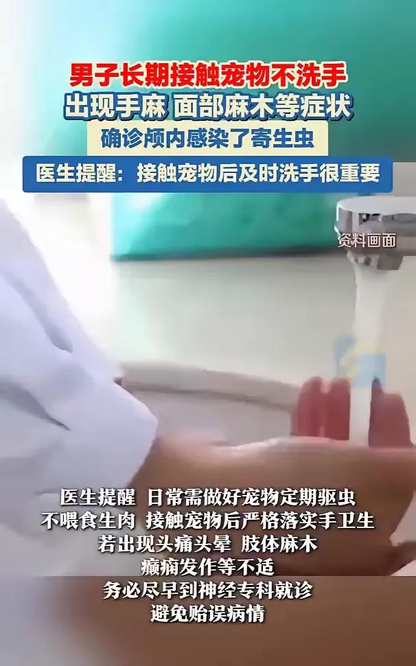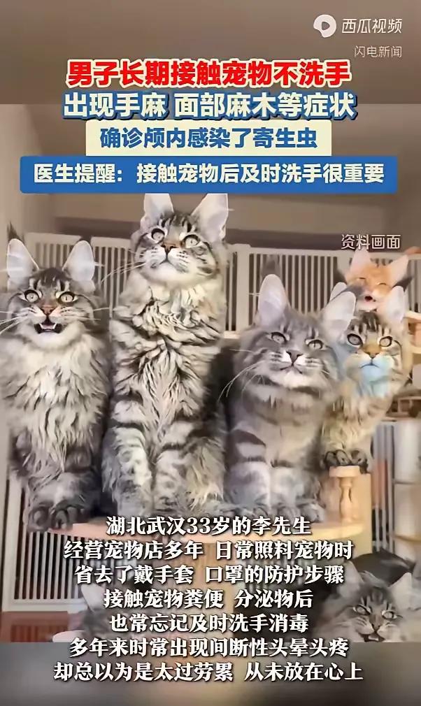 “悲剧还是发生了!”湖北武汉,一男子开了家宠物店,在照料宠物时图省事,不防护也不及时消毒,这导致男子多年来时常出现间断性头晕头疼,他还以为是自己太过劳累,直到手和面部发麻,才去医院,最后确诊颅内感染了寄生虫! 33岁的李先生,开宠物店这么多年,天天跟猫猫狗狗打交道,肯定是打心底里喜欢这些小家伙。平时给宠物喂食、铲屎、打理,忙起来哪顾得上戴手套口罩,摸完宠物、碰完粪便分泌物,随手就去擦汗、拿东西吃,洗手消毒更是经常忘。 李先生断断续续出现了头晕头疼,全被他归根于开店太累、熬夜忙生意上,压根没往寄生虫上想。直到手麻、脸麻的症状找上门,他才慌了神去医院,结果一查,寄生虫已经钻进了颅内,这可不是小事,后续的治疗、对身体的伤害,想想都让人心疼。 其实很多人都忽略了,宠物身上哪怕做了驱虫,也可能携带虫卵和病菌。尤其是宠物店这种环境,宠物多、接触频繁,防护不到位、卫生不注意,真的就是在给病菌开门。很多养宠人总觉得自己家宠物干净,不用太讲究,可就是这种一次次的“图省事”,最后酿成了大问题。 医生的提醒真的不是危言耸听。定期给宠物驱虫、别喂生肉,接触宠物后认认真真洗手消毒,这些看似麻烦的小事,其实都是在给自己的健康上保险。要是真出现了头晕头疼、肢体麻木甚至癫痫发作的情况,千万别硬扛,赶紧去神经科检查,别等小毛病拖成大问题,到时候后悔都来不及。 养宠是件很治愈的事,但前提是要做好防护、守好卫生。别让一时的侥幸,毁掉自己的健康,也别让喜欢变成伤害。 各位读者你们怎么看?欢迎在评论区讨论。