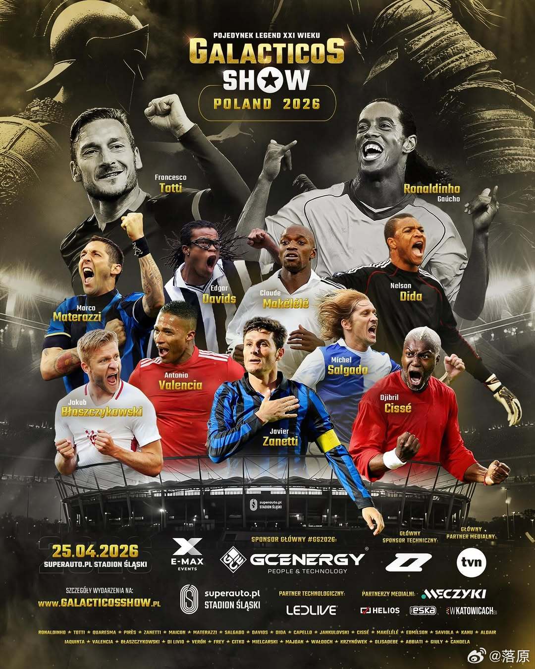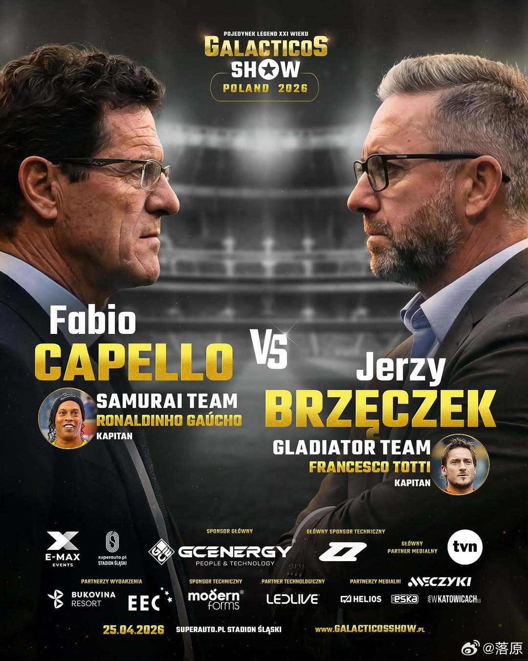 4 月 25 日,波兰“传奇明星赛”,罗纳尔迪尼奥和托蒂分别领衔世界明星队 vs 欧洲明星队。