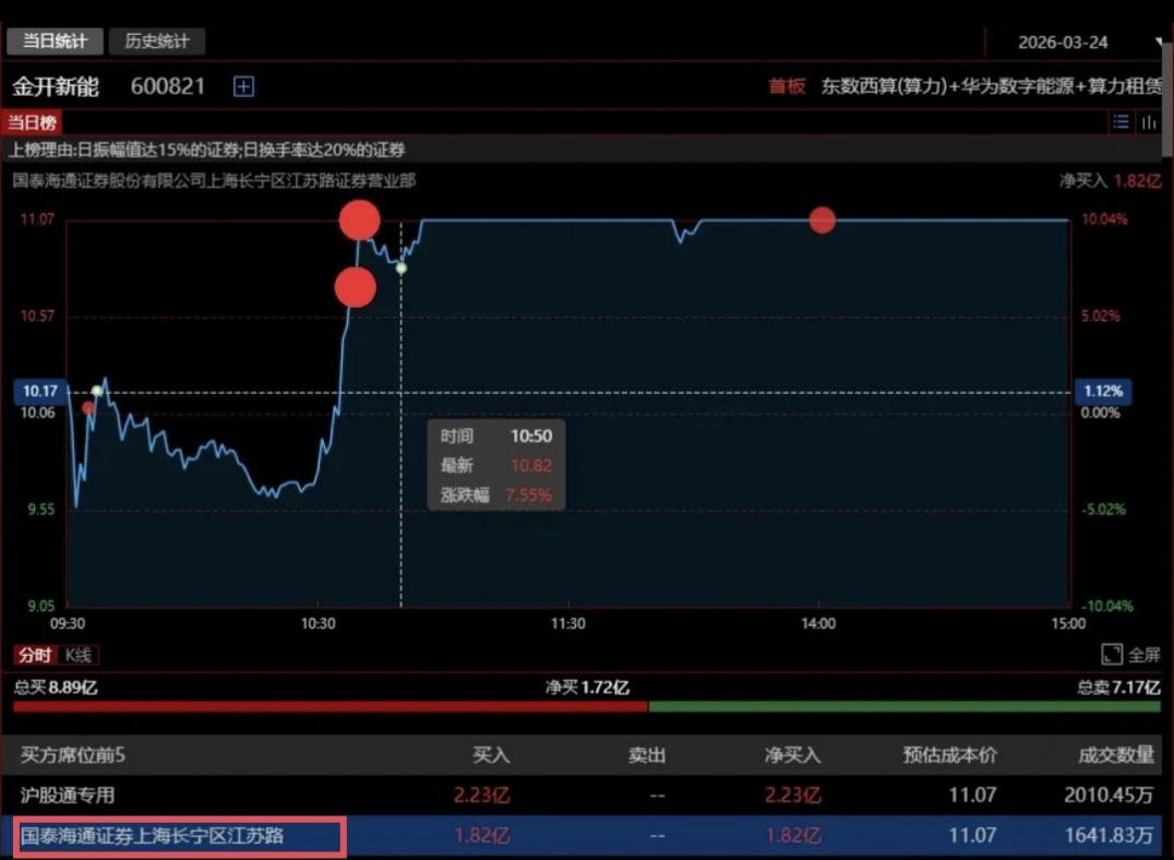 章盟主爆买1.8亿! 今天金开新能盘中涨停。 盘后龙虎榜显示,章盟主再次出手